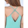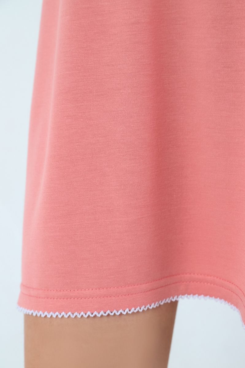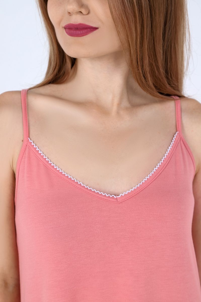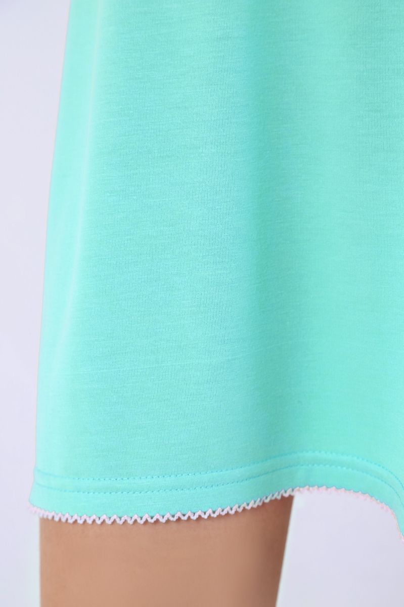 Сорочка - молодежная из гладкокрашеного трикотажного полотна «джерси», свободного покроя, слегка расширенная к низу, без рукавов, с V-образным вырезом горловины переда и спинки. Горловина окантована основным материалом и дополнительно украшена декоративной строчкой «кроше» нитками контрастного цвета. На спинке - декоративный элемент в виде перекрещенных между собой бретелей. Проймы окантованы основным материалом.