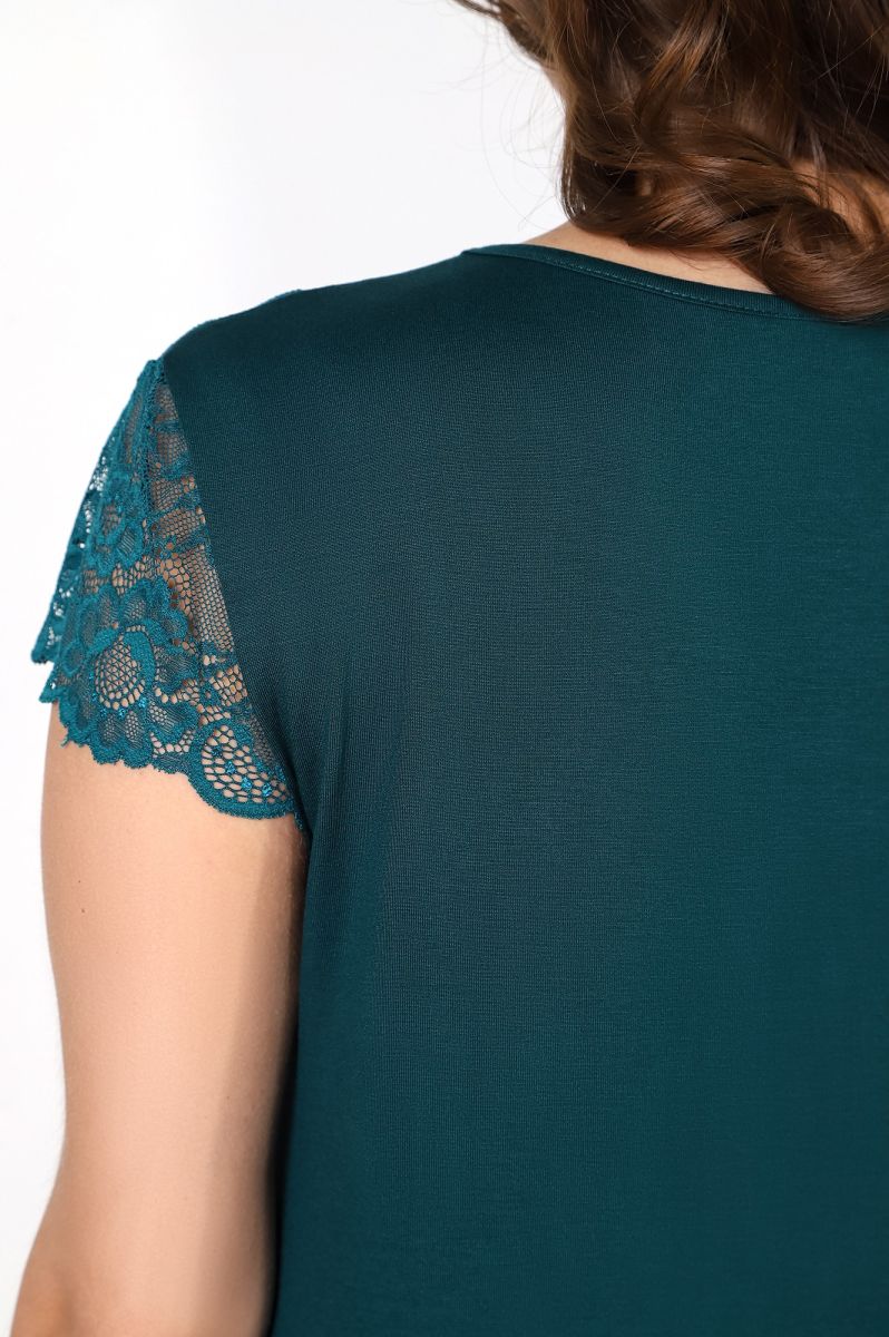 Сорочка молодежная из вискозного трикотажного гладкокрашенного полотна с отделкой кружевом в тон основного материала, расширенная книзу, с короткими втачными рукавами. Верхний срез детали переда имеет фигурный вырез, окантованный основным материалом.