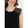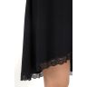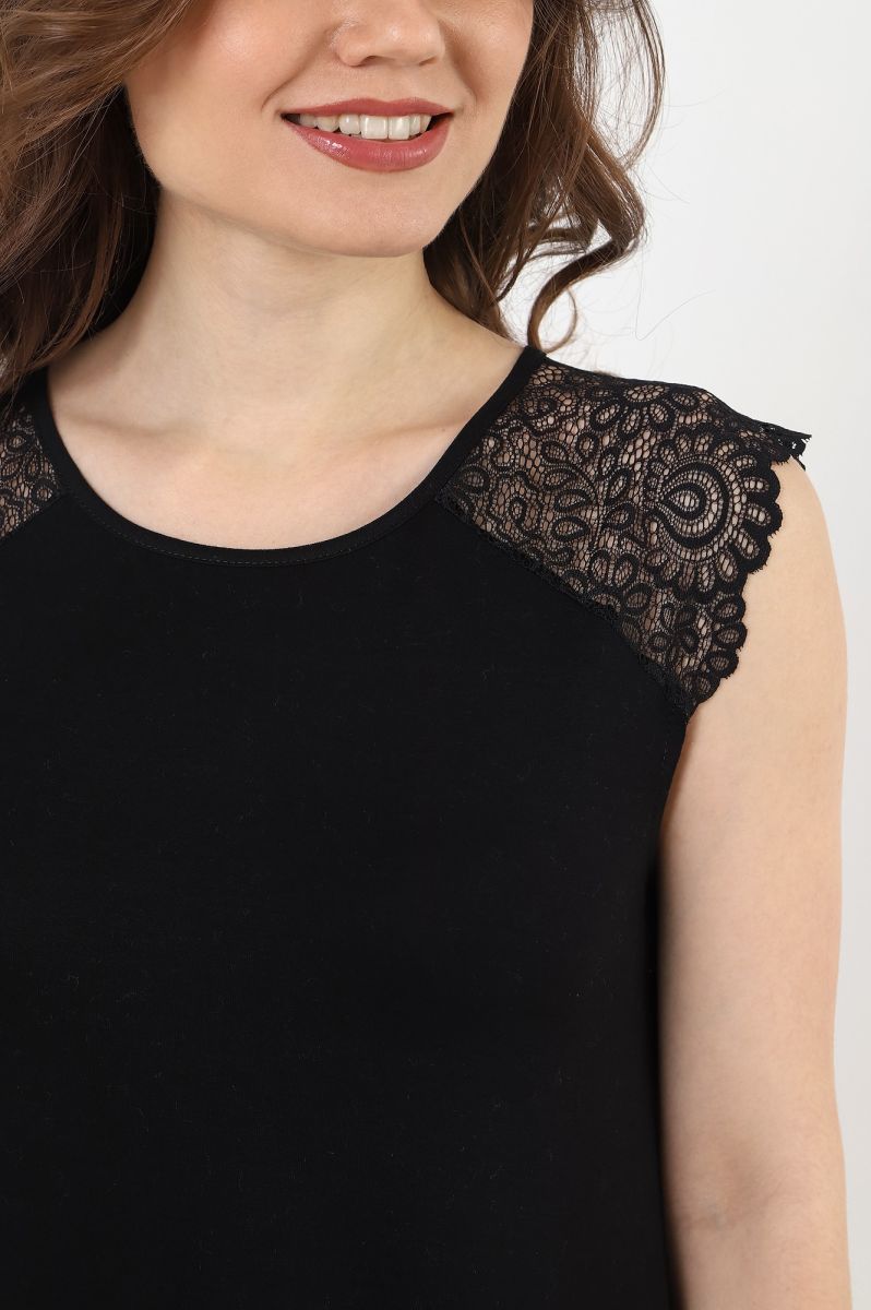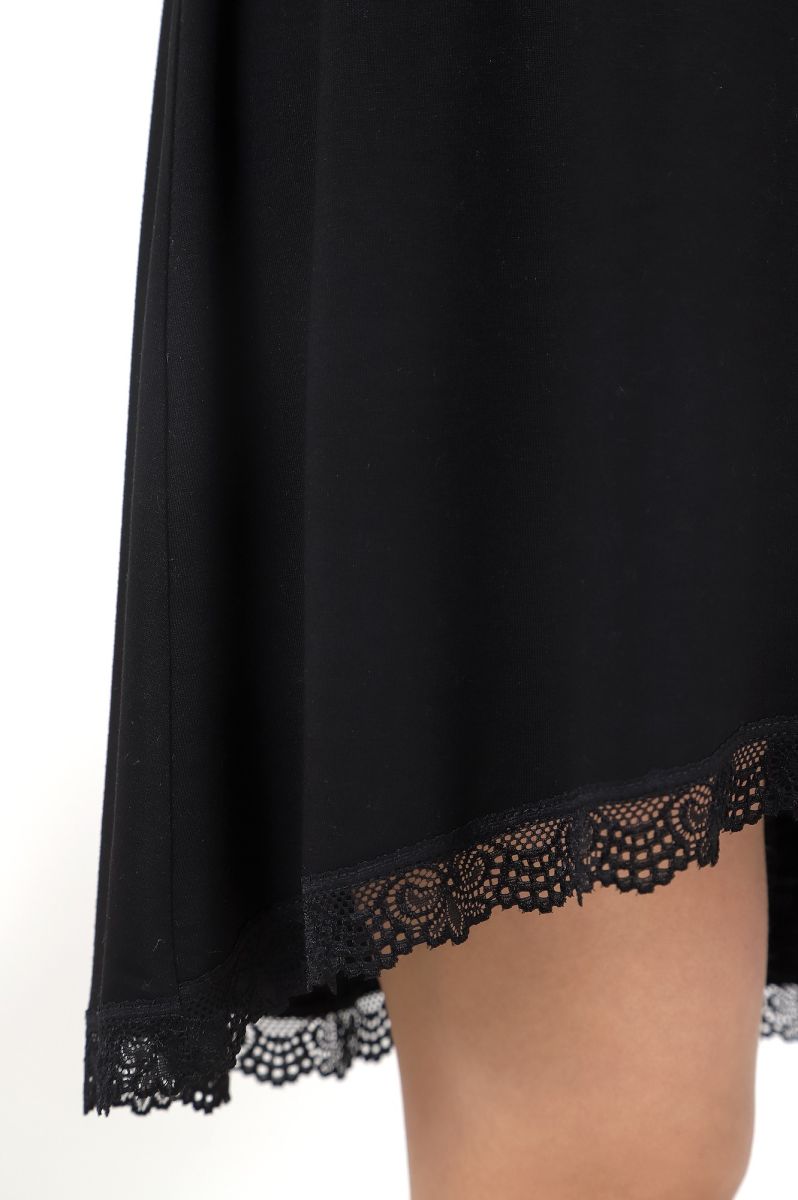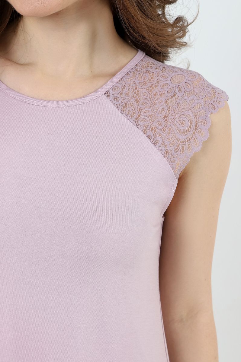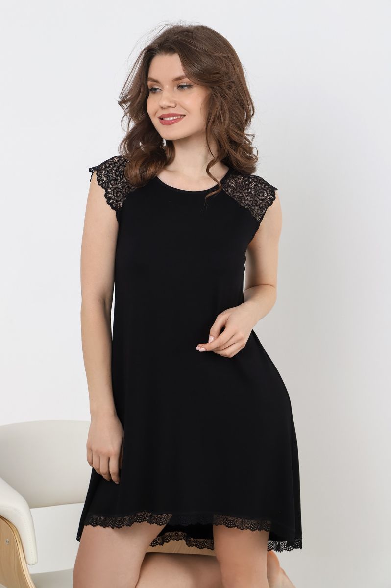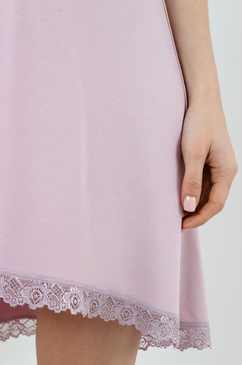Сорочка молодежная из гладкокрашенного трикотажного вискозного полотна, слегка расширенная книзу, с короткими кружевными рукавами покроя «реглан» и горловиной овальной формы. Горловина окантована основным материалом. Низ изделия имеет фигурную форму и обработан кружевом.