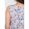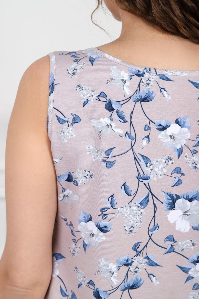 Сорочка женская из трикотажного вискозного полотна с набивным рисунком, слегка расширенная книзу, без рукавов, с кружевной вставкой-кокеткой V-образной формы и небольшой драпировкой в центре груди. Горловина и проймы окантованы основным материалом