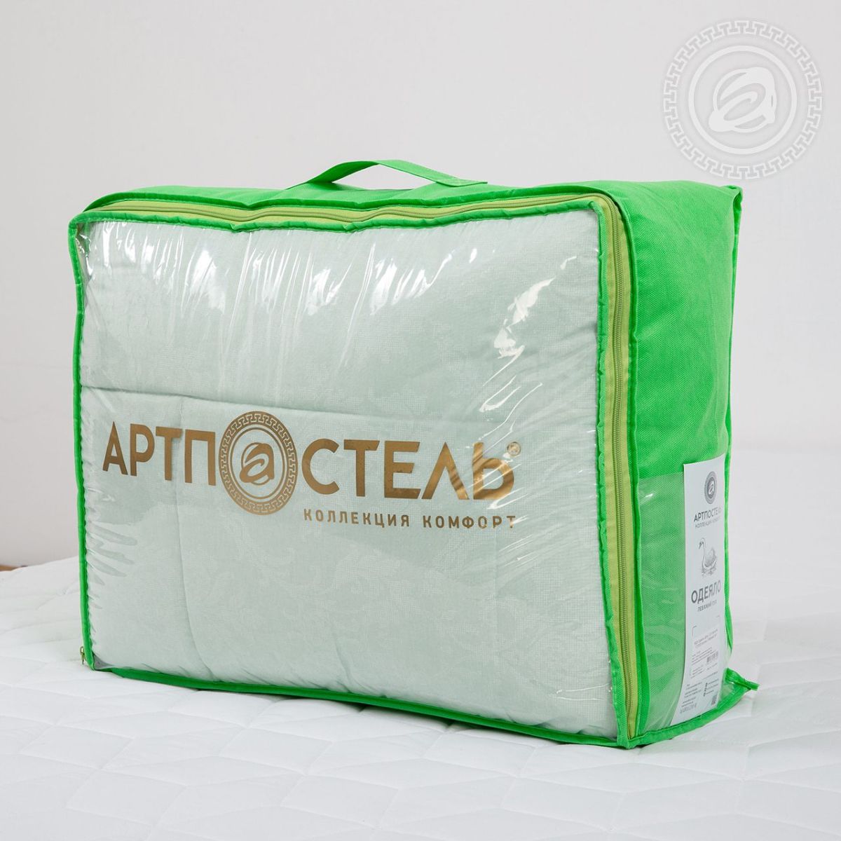 Наполнитель дополнительно закрыт слоем спанбонда с обеих сторон, что обеспечивает его надежную фиксацию внутри изделия. Это делает одеяло еще более прочным и долговечным в процессе эксплуатации.