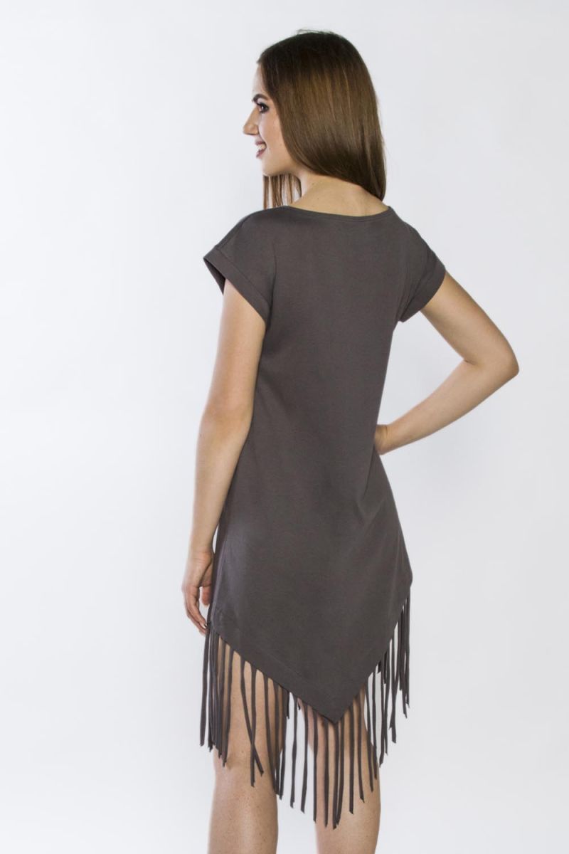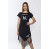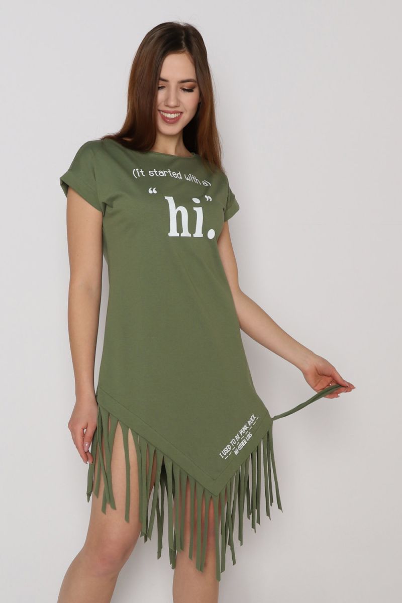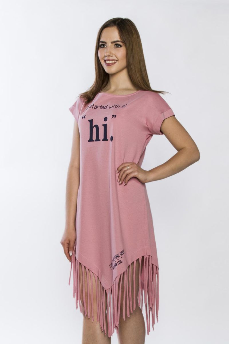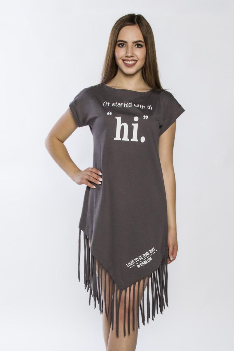 Яркая, и одновременно сдержанная туника Hi станет отличным домашним платьем для девушек. Выполнен из легкого материала - кулирка. Фасон свободный, прямой. Подол угловатой формы, выполнен в виде длинной бахромы. Рукава короткие, слегка прикрывающие плечи. Монотонный оттенок разбавлен светлой принтовой надписью.