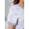 Футболка - из полотна с набивным цветочным рисунком слегка расширенная книзу, с короткими втачными рукавами, горловиной V-образной формы, обработанной широкой окантовкой из отделочного материала, переходящей в небольшой разрез, имитирущий застежку с втачными планками на две пуговицы и украшенную небольшим бантиком из узкой атласной ленты. Нижние срезы изделия и рукавов обработаны кружевом.