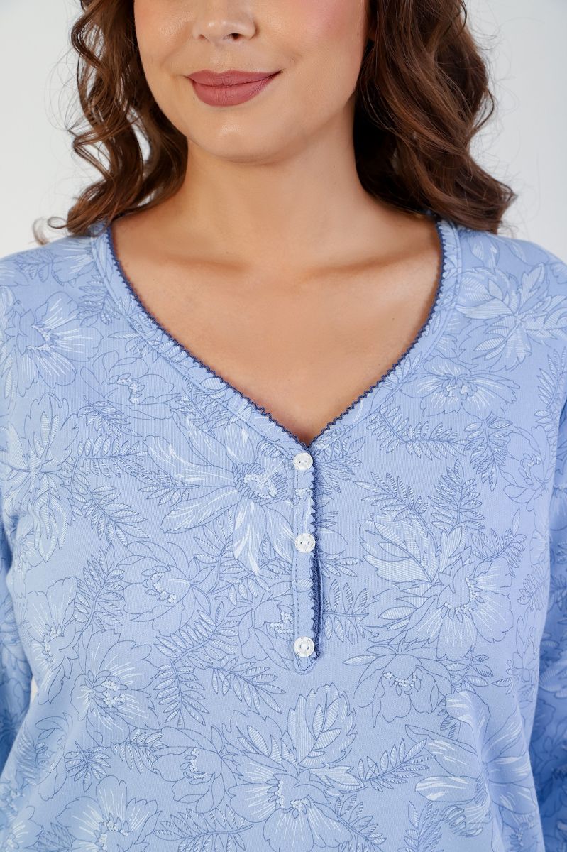 Футболка - с длинными рукавами, горловиной V-образной формы, переходящей в разрез спереди. Горловина и разрез окантованы основным материалом и дополнительно украшены декоративной строчкой «кроше» нитками контрастного цвета.