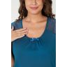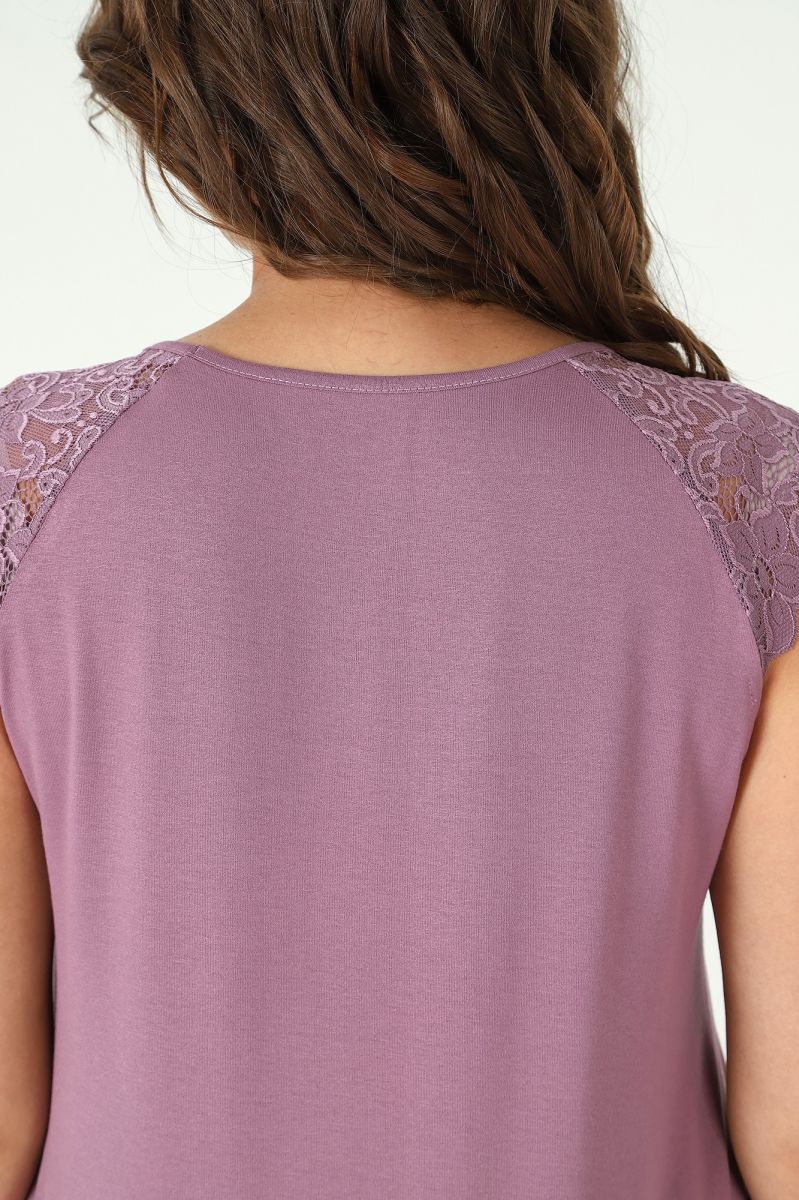 Футболка - слегка расширенная книзу, с короткими кружевными рукавами покроя «реглан» и горловиной овальной формы, окантованной основным материалом. По срезу горловины выполнена небольшая сборка, по центру декоративный бантик из узкой атласной ленты.