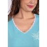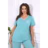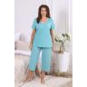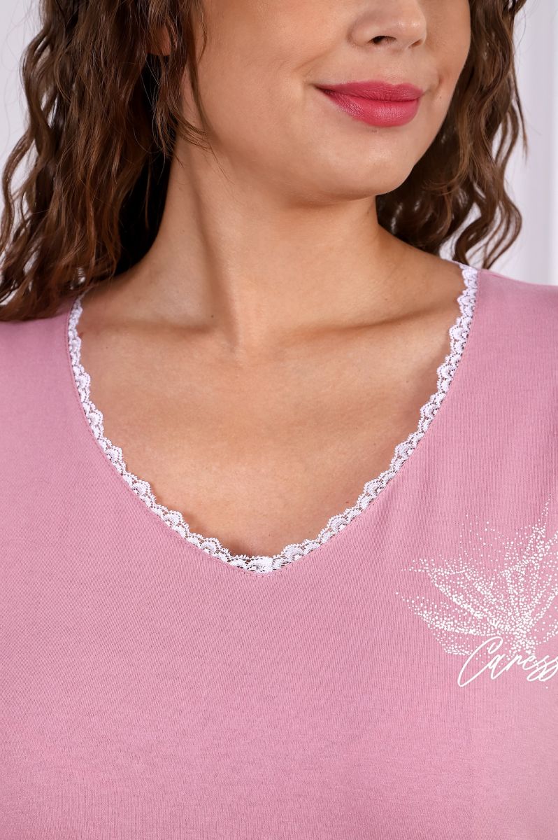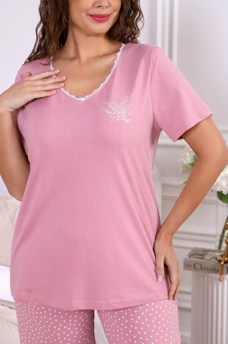 Пижама женская из трикотажного полотна «кулирка» в комбинации двух видов: гладкокрашеного и с набивным рисунком, состоящая из футболки и бридж. Футболка – из гладкокрашеного полотна, с короткими втачными рукавами и горловиной V-образной формы. Срезы горловины обработаны узким кружевом.