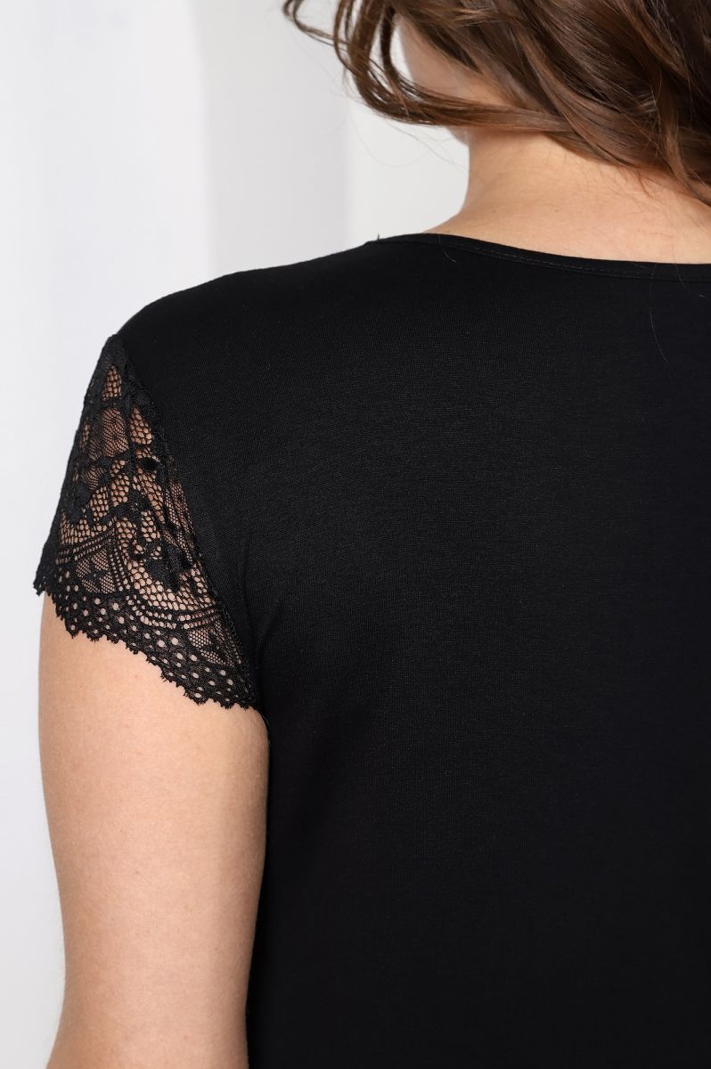 Пижама молодежная из вискозного трикотажного гладкокрашенного полотна с отделкой кружевом в тон основного материала, состоящая из футболки и шорт.