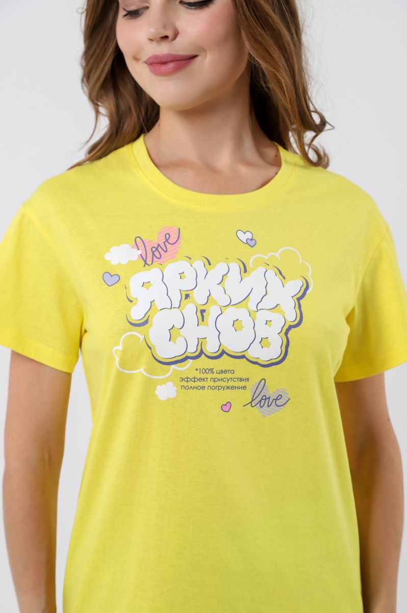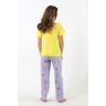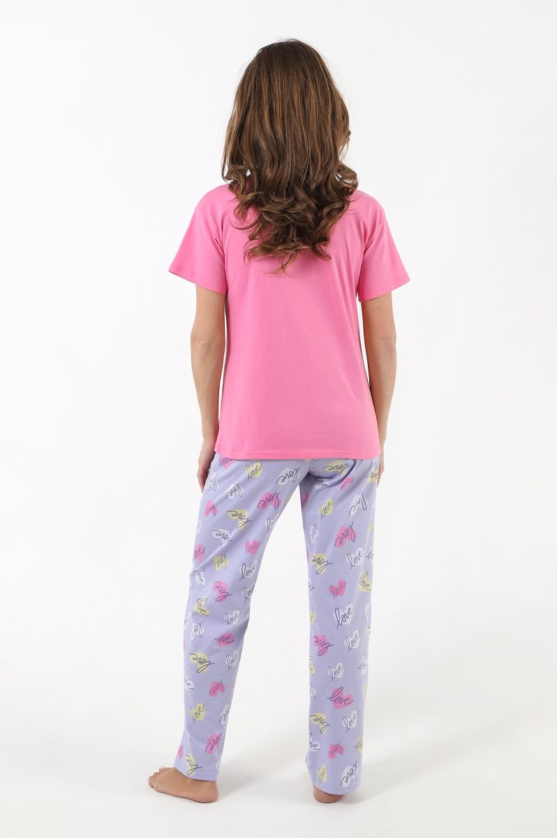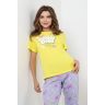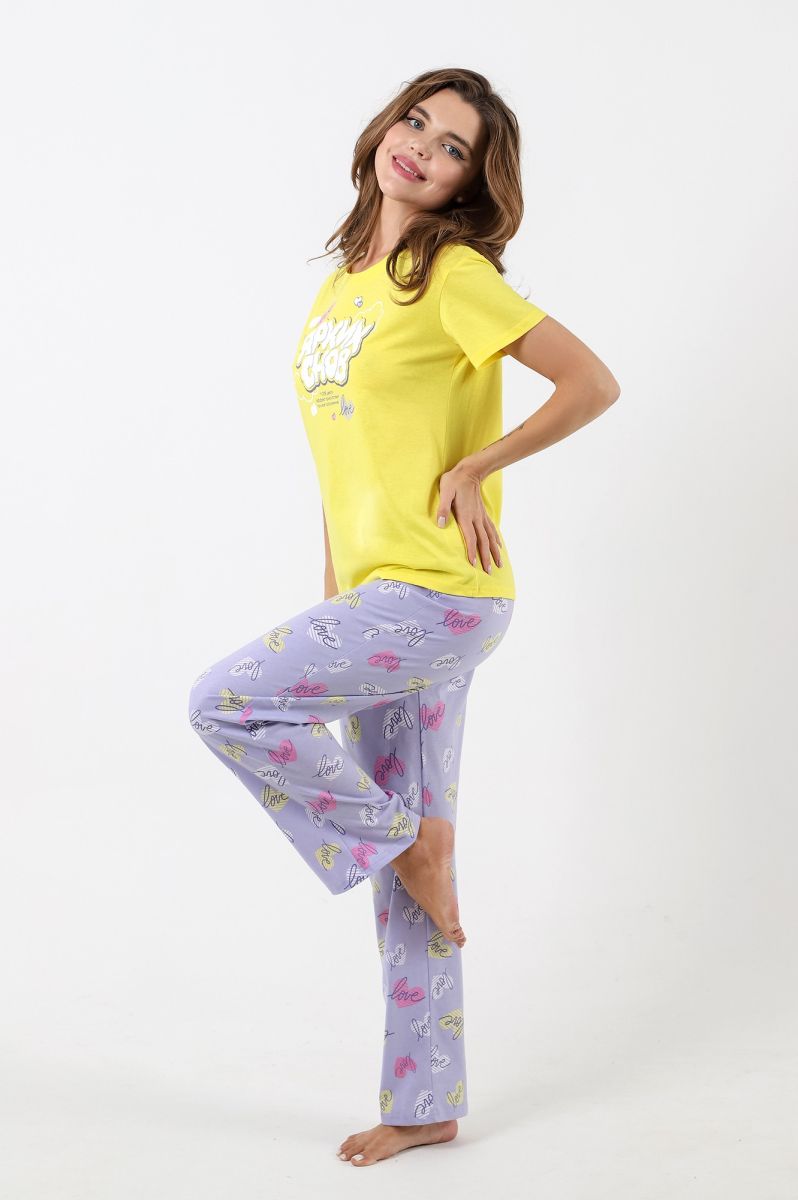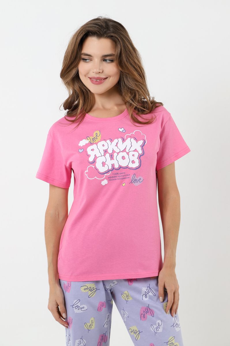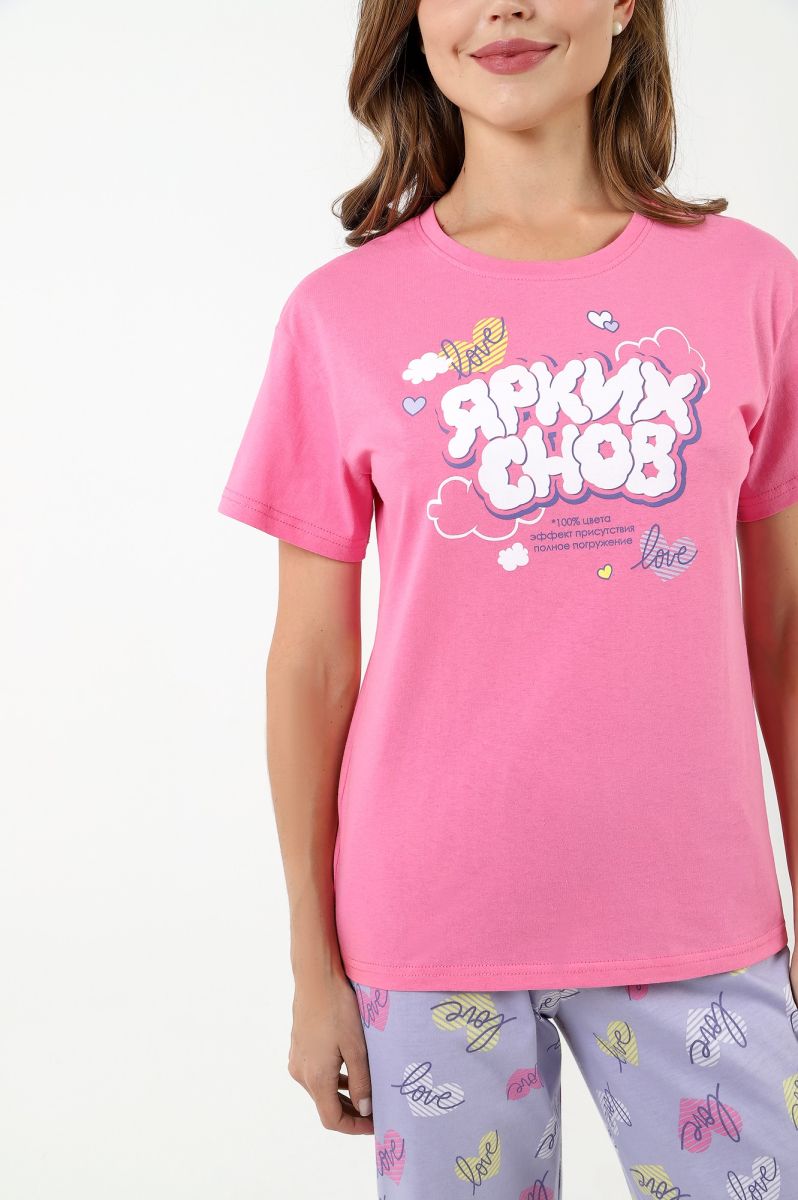 Пижама молодежная из трикотажного полотна «кулирка» в комбинации двух видов: гладкокрашеного и с набивным рисунком, состоящая из футболки и брюк. Футболка – из гладкокрашеного полотна, классического покроя, с короткими втачными рукавами, горловиной овальной формы, обработанной притачной бейкой и принтом на полочке, выполненным в технике «шелкографии».Брюки – из полотна с набивным рисунком, классического покроя, с эластичной тесьмой по талии.