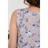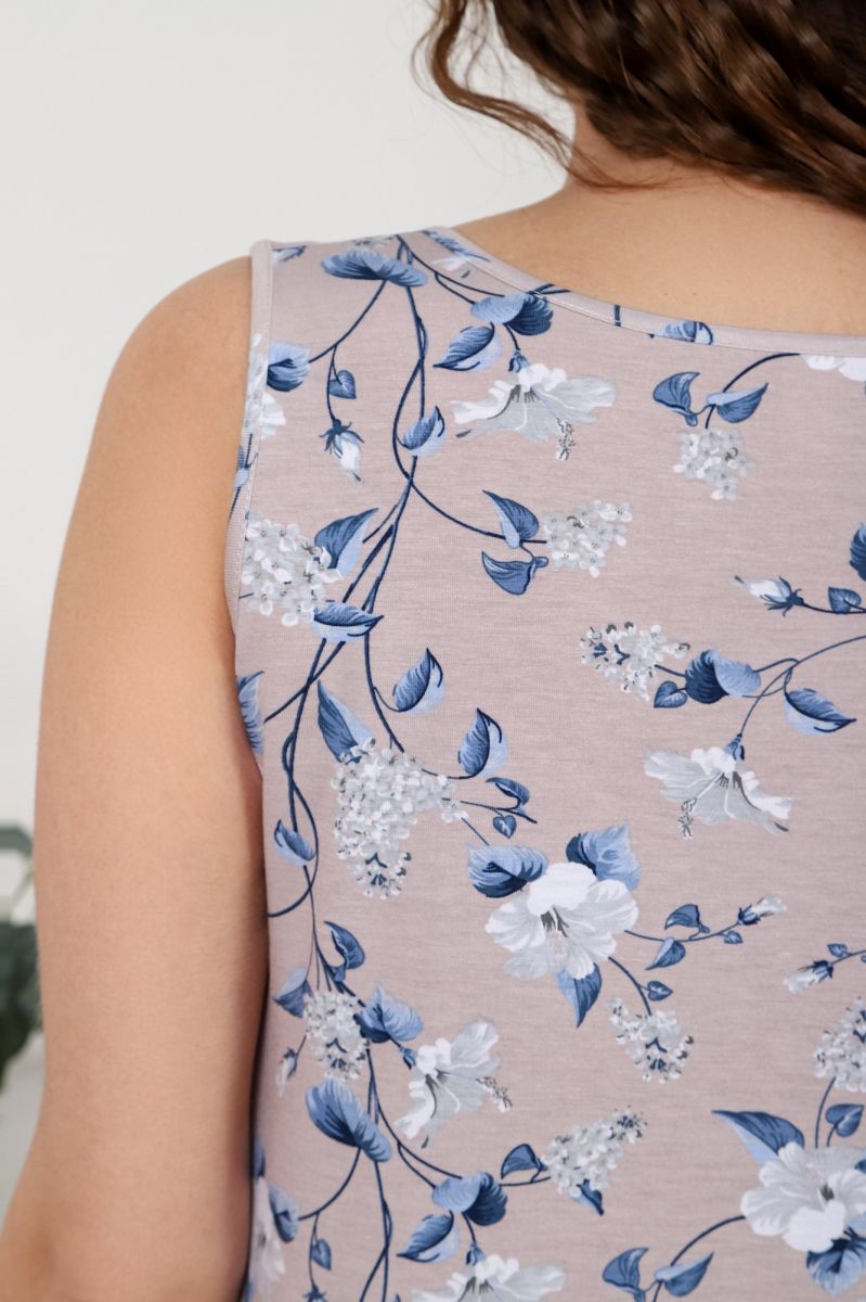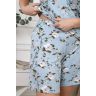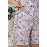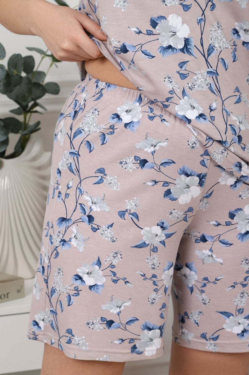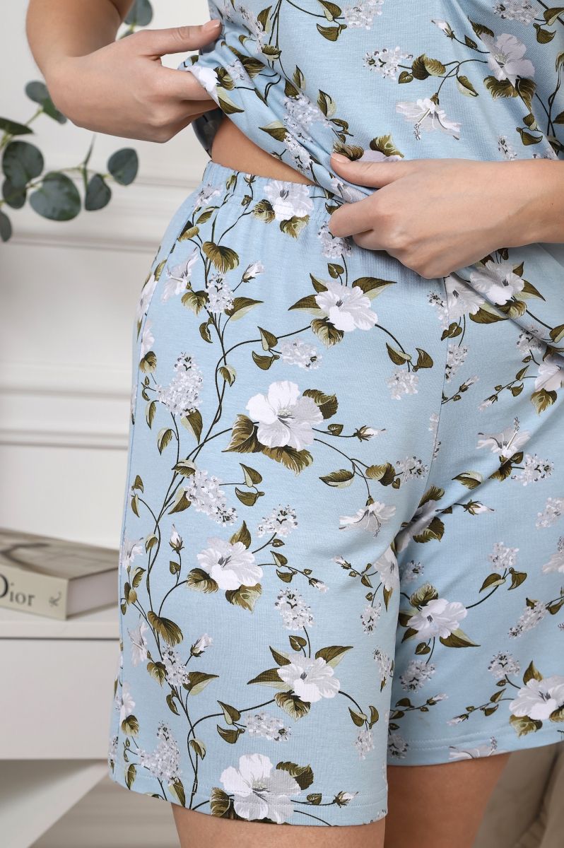 Пижама женская из трикотажного вискозного полотна с набивным рисунком, с отделкой кружевом, состоящая из майки и шорт. Майка - слегка расширенная книзу, с кружевной вставкой-кокеткой V-образной формы и небольшой драпировкой в центре груди.Шорты – удлиненные, с эластичной тесьмой по талии.