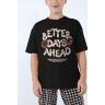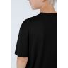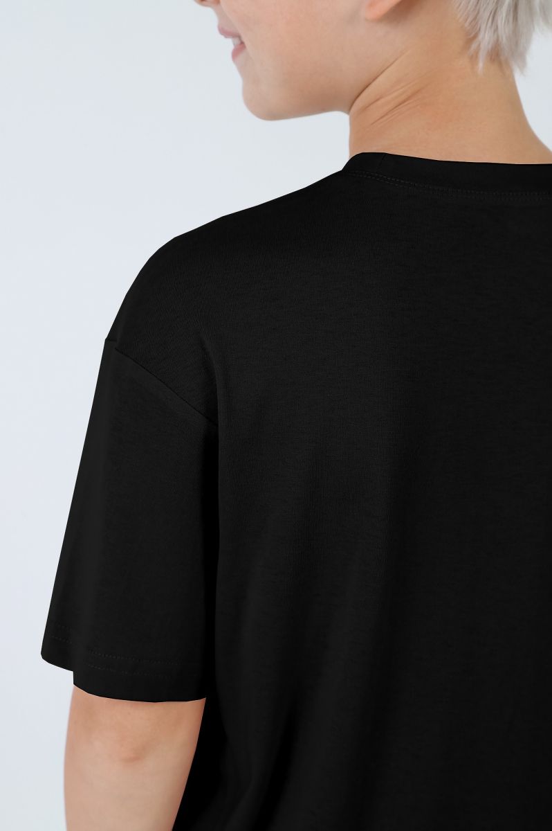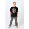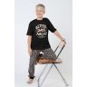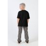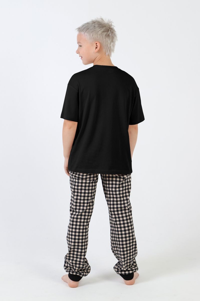 Футболка - из гладкокрашеного трикотажного полотна "кулирка", классического покроя: с короткими втачными рукавами, горловиной овальной формы, обработанной втачной планкой и принтом в центре переда, выполненным в технике шелкографии. Брюки - из трикотажного полотна "кулирка" в клетку, длинные, с эластичной тесьмой на поясе и притачными манжетами из полотна "кашкорсе" черного цвета.