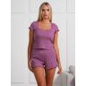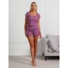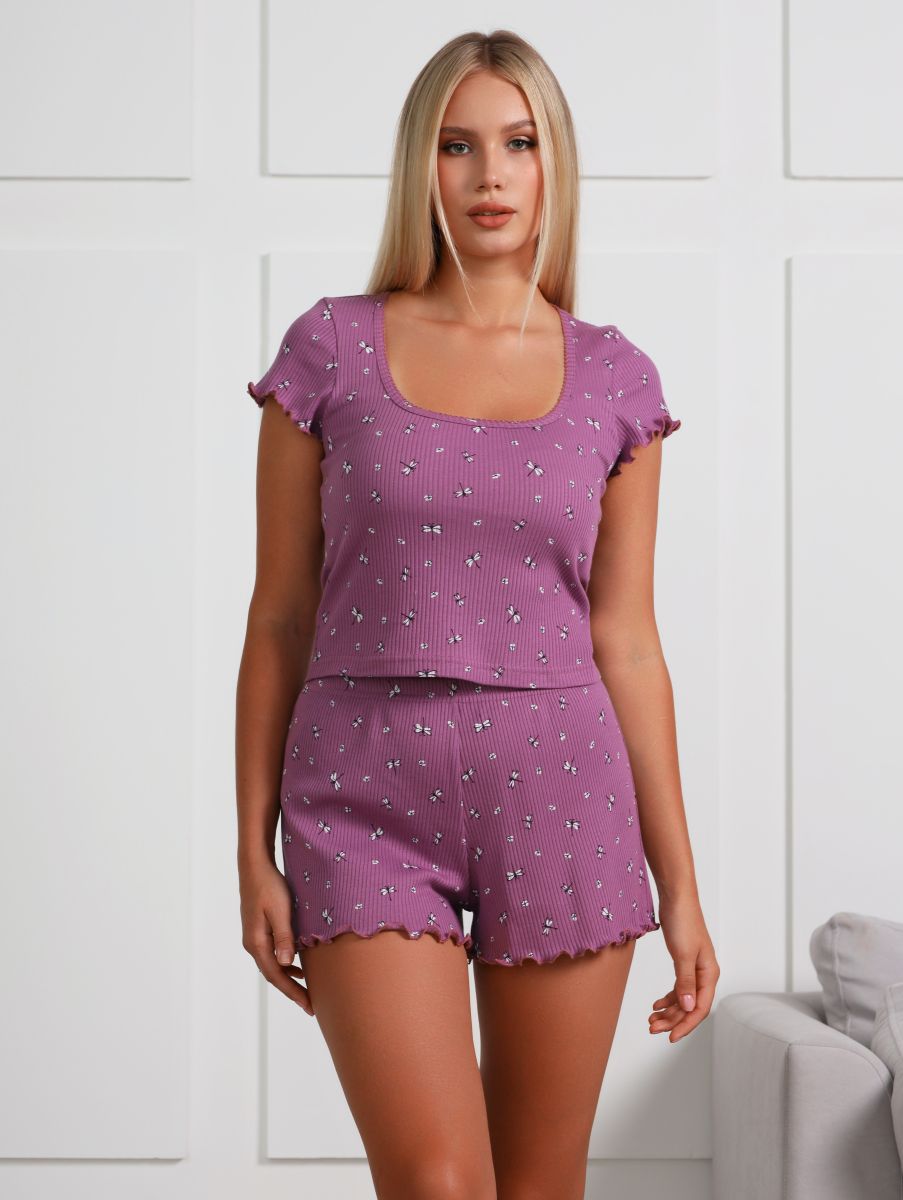 Пижама молодежная из трикотажного полотна «кашкорсе» с набивным рисунком, состоящая из футболки и шорт. Футболка - классического покроя с углубленной формой горловины, окантованной основным материалом и украшенной декоративной строчкой «кроше». Нижние срезы рукавов обработаны узкой обметочной строчкой, создающей красивый волнистый край.