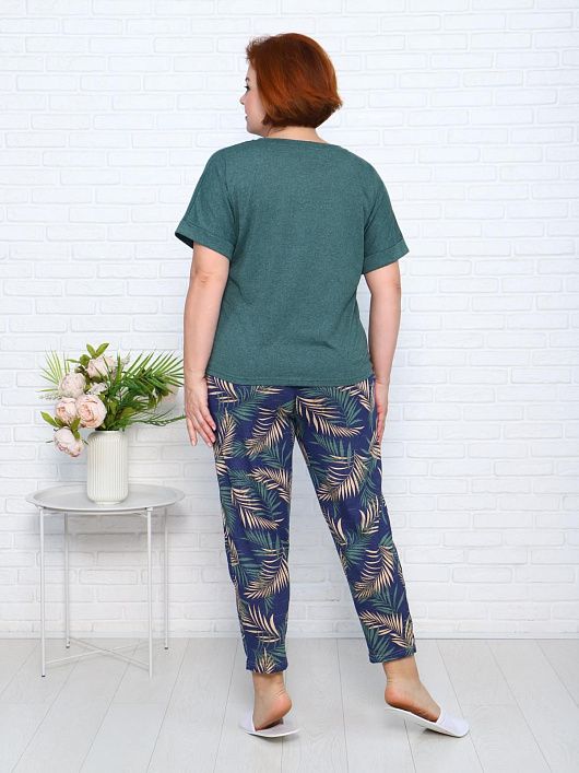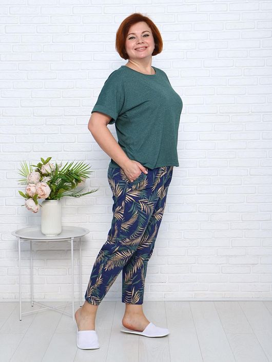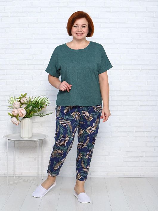 Костюм выполнен из ткани кулирка 100% хлопок. Футболка со спущенным рукавом с манжетой. Горловина обтачка. Бриджи с карманами и кокеткой. Пояс с резинкой 3 см. Под кокеткой складки.