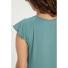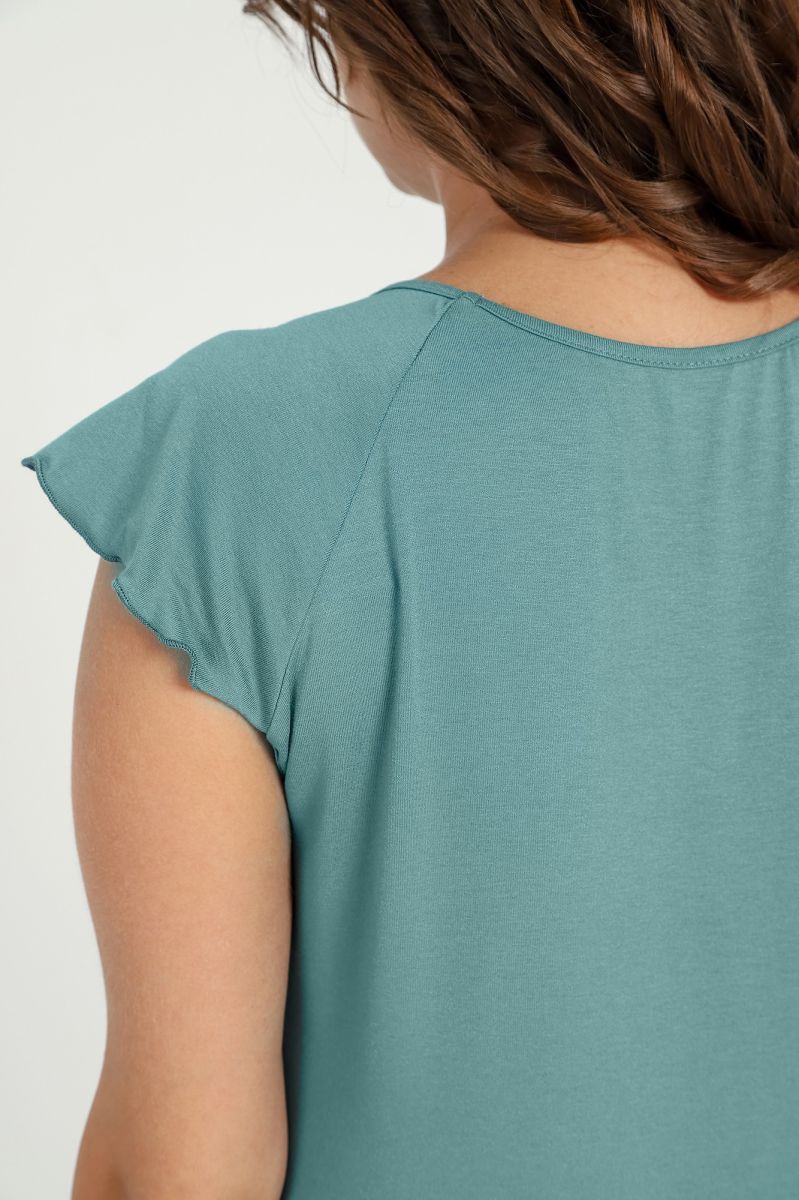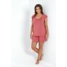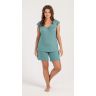 Пижама женская из гладкокрашенного трикотажного вискозного полотна, состоящая из футболки и шорт. Футболка - слегка расширенная книзу, с короткими рукавами покроя «реглан» и горловиной овальной формы. Проймы и горловина окантованы основным материалом. По срезу горловины выполнена небольшая сборка. Нижние срезы рукавов обработаны узкой обметочной строчкой. Шорты – свободного покроя, удлиненные, с эластичной тесьмой по талии.