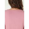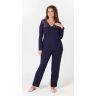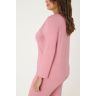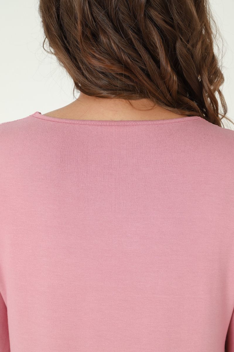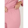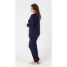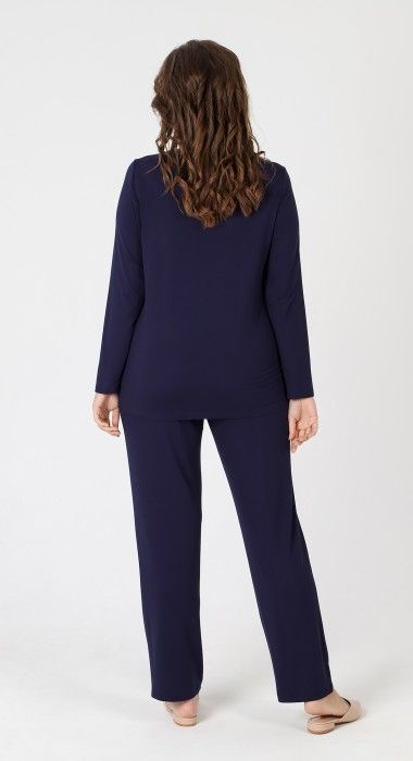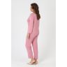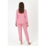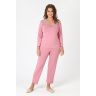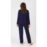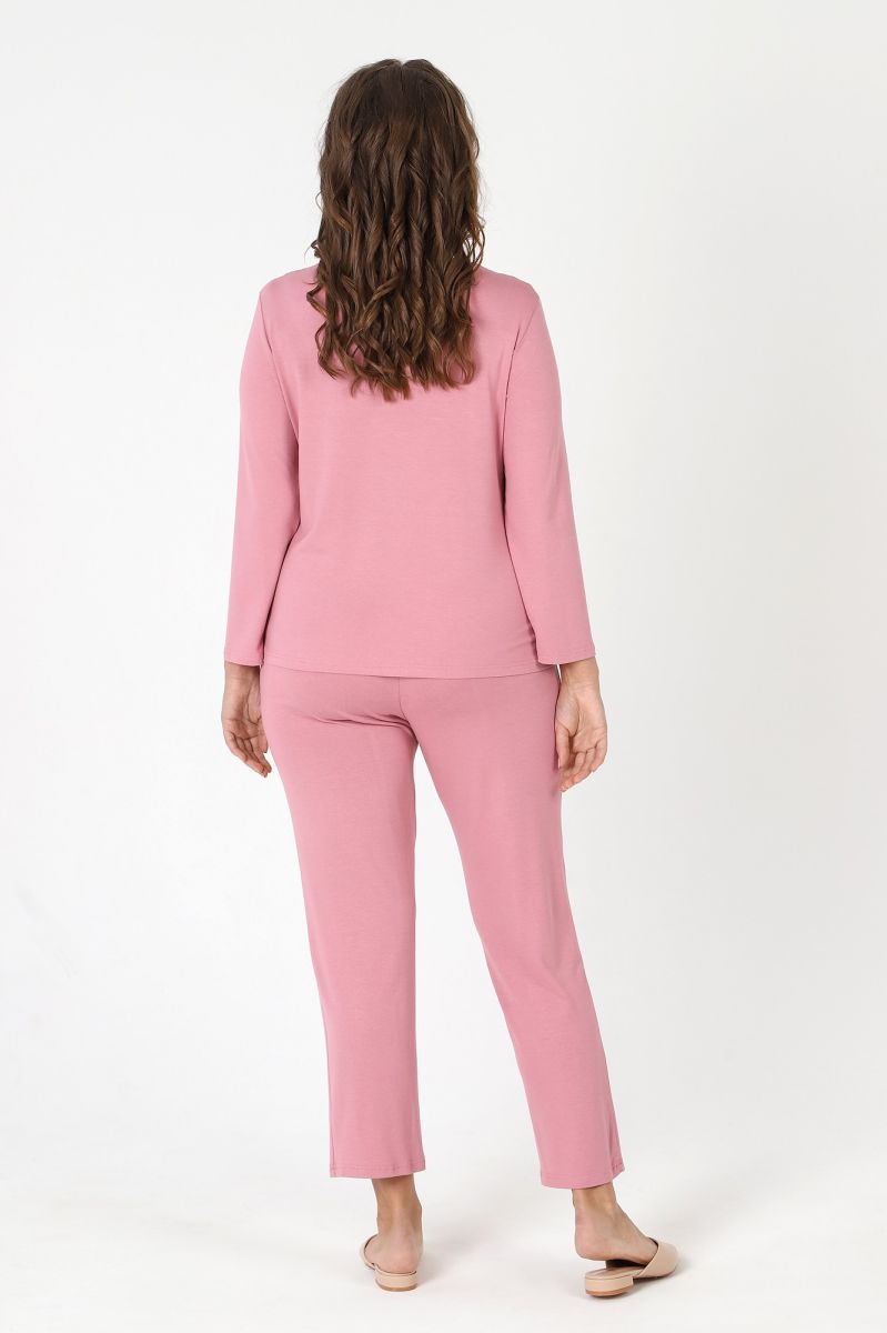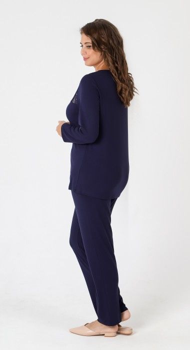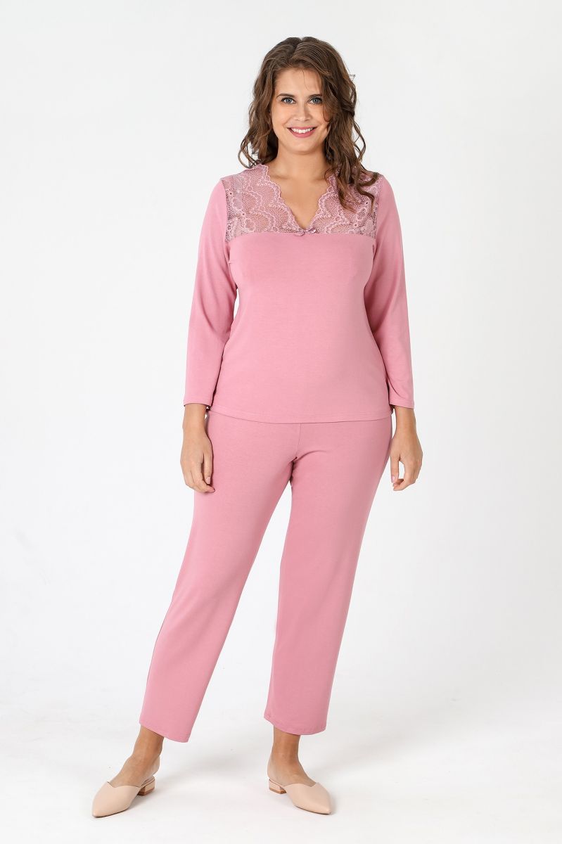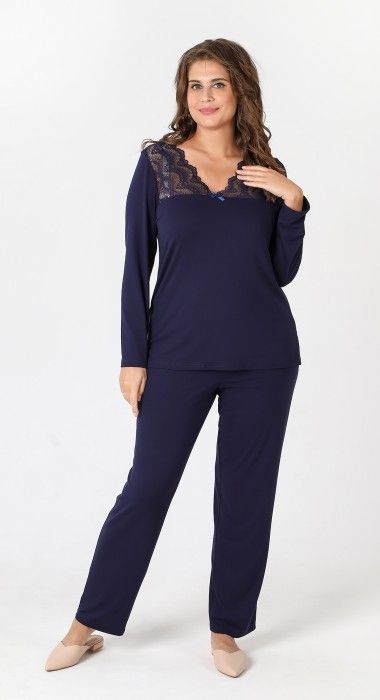 ижама женская из гладкокрашеного трикотажного вискозного полотна, состоящая из пижамной блузы и брюк. Пижамная блуза – прямого силуэта, с длинными втачными рукавами, горловиной V-образной формы. Перед с притачной кружевной кокеткой и декоративным бантиком из узкой атласной ленты в центре соединительного шва. Брюки – свободного покроя с эластичной тесьмой по талии.