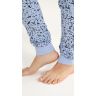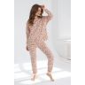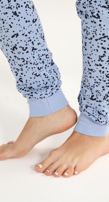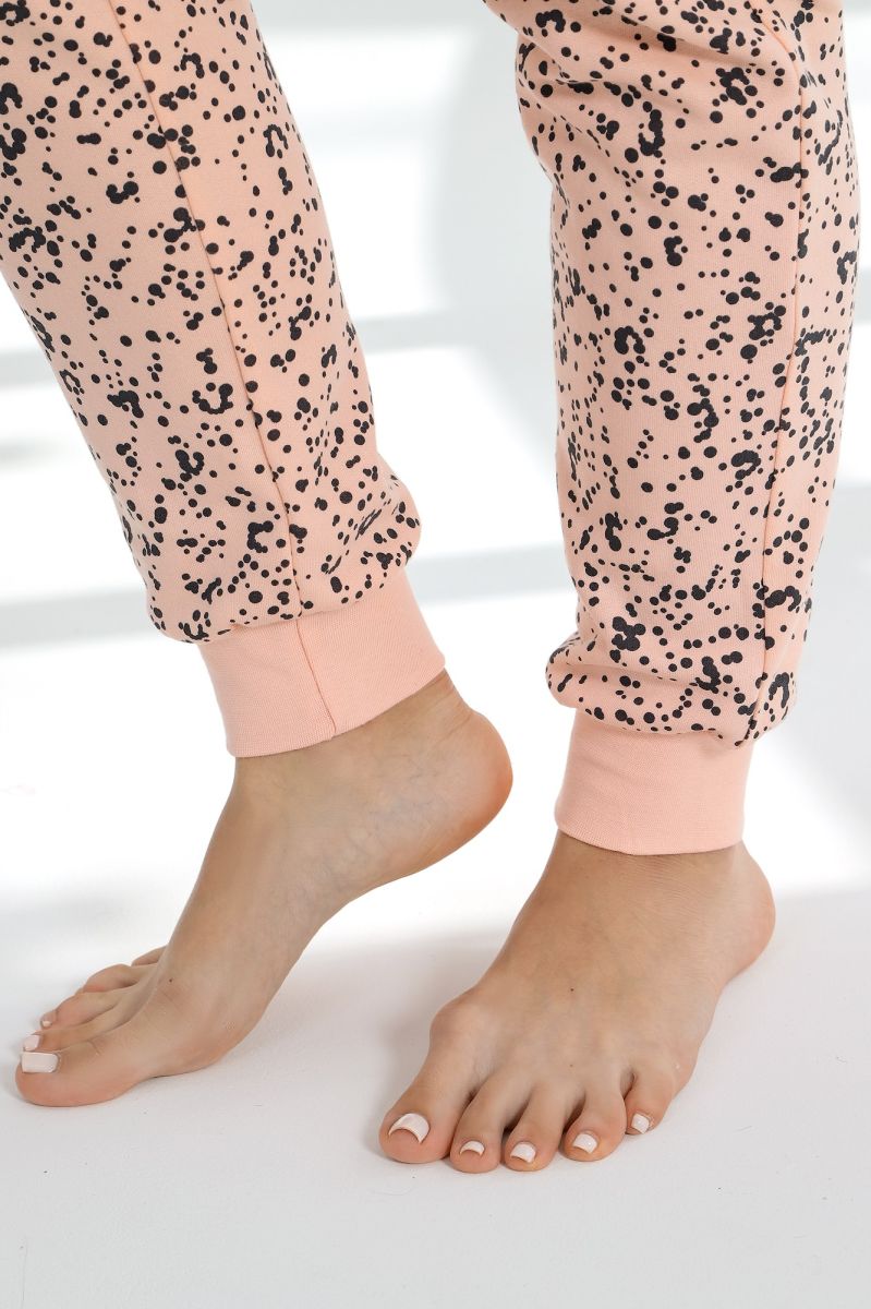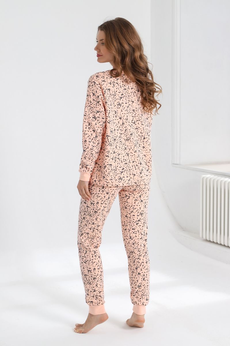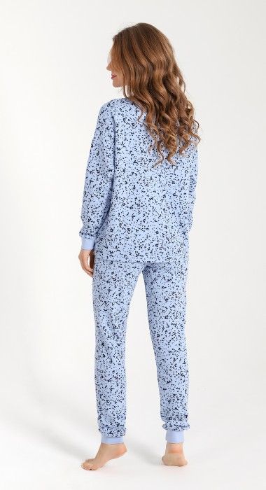 Пижама из трикотажного полотна «футер-двунитка с начесом» с набивным рисунком, состоящая из футболки и брюк. Футболка - с длинными рукавами на основе цельнокроеных и овальной горловиной. Втачная бейка горловины и манжеты рукавов выполнены из эластичного полотна «рибана» в цвет основного материала. Брюки – длинные, на резинке по талии, с притачными манжетами из эластичного полотна «рибана» в цвет основного материала.