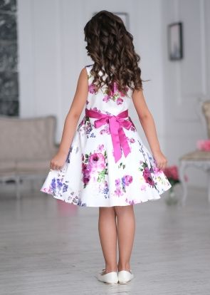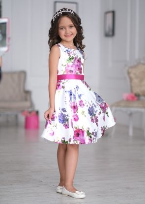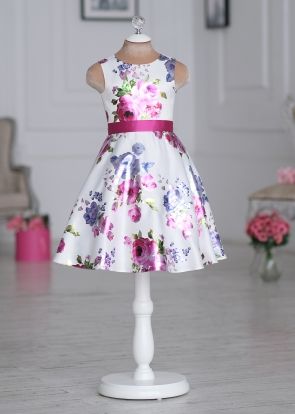 Платье из атласной ткани с цветочным принтом. Нанесение рисунка цветов с эффектом серебристого отблеска.