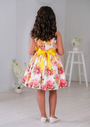 Платье без рукава, выполнено из принтованной атласной ткани с мелким золотистым напылением с цветочным мотивом. Платье отрезное по линии талии, с застёжкой на молнию от горловины по среднему шву спинки.