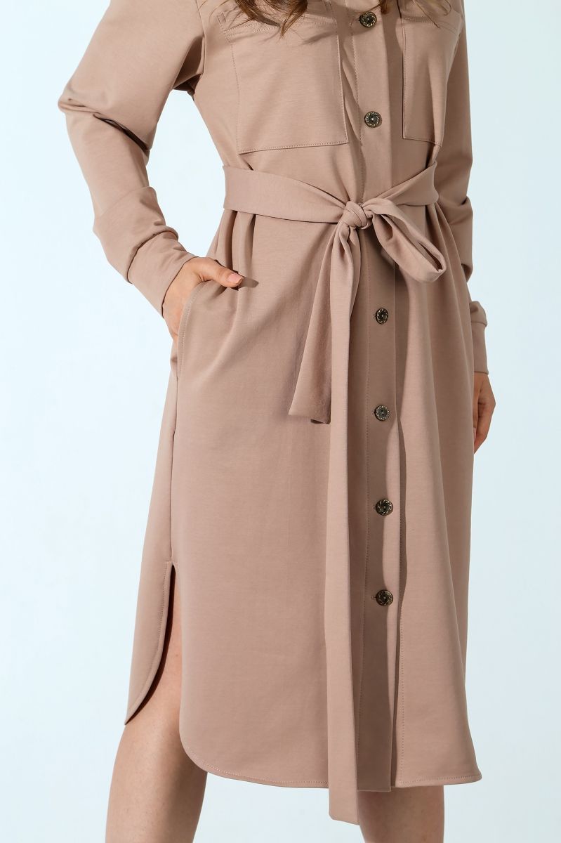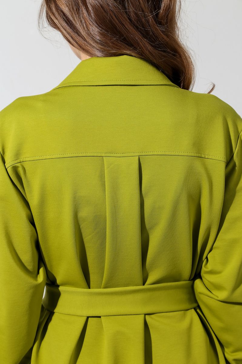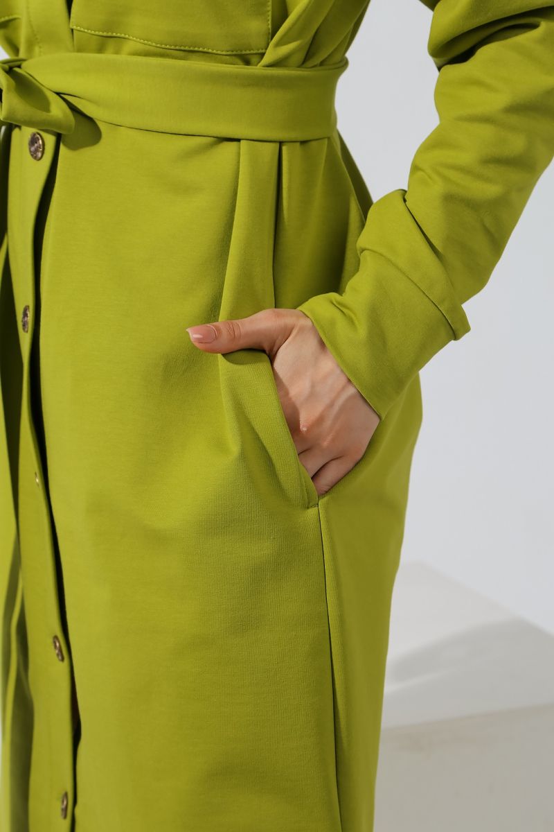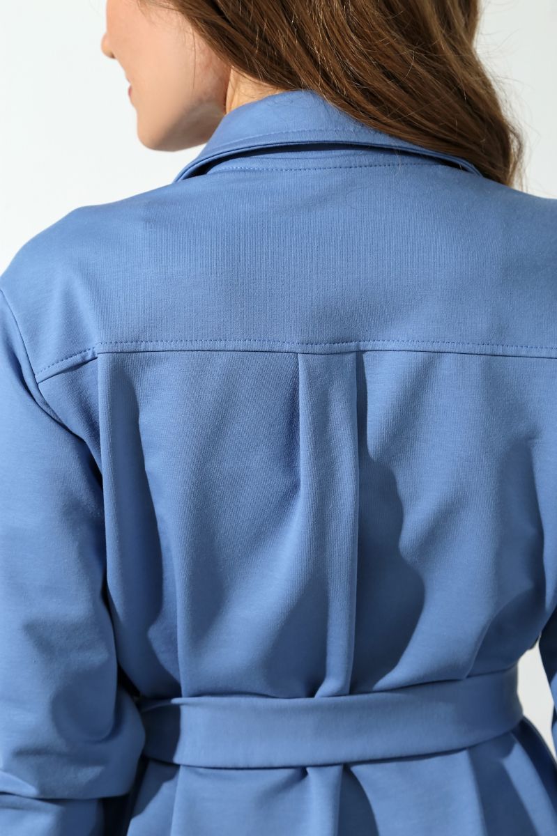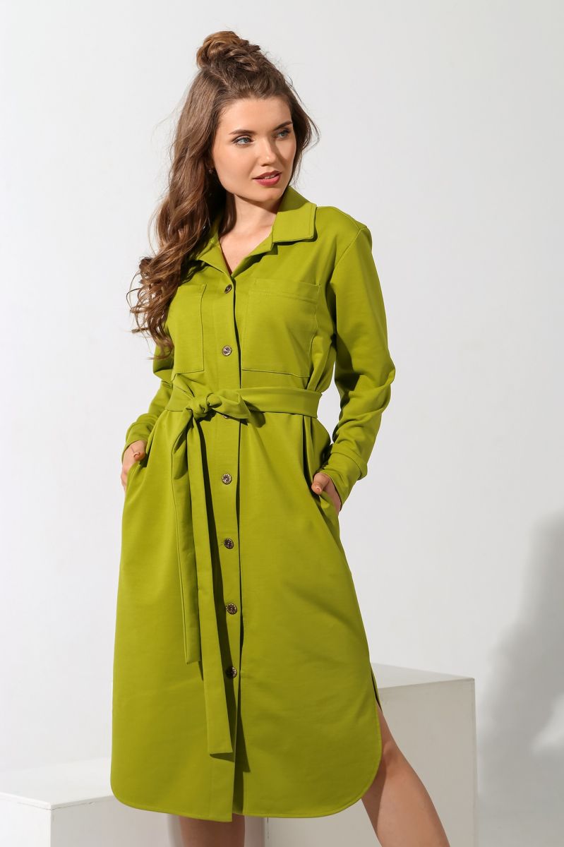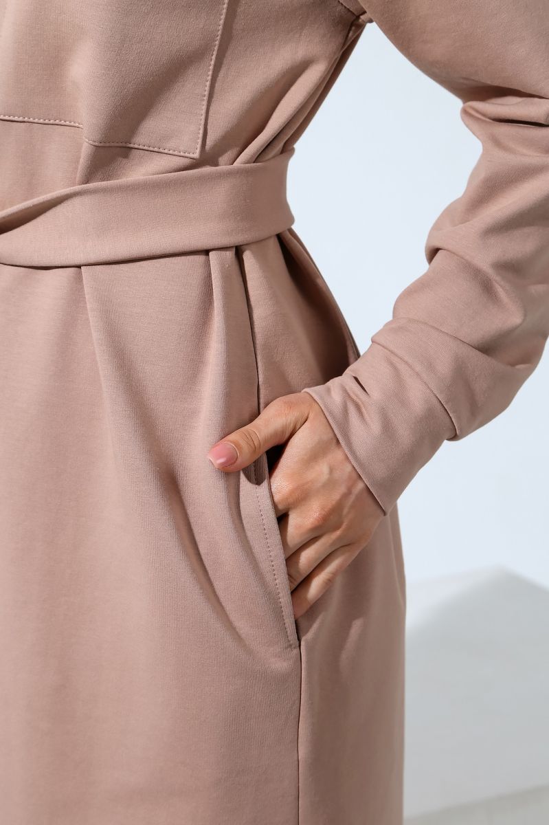 Из гладкокрашеного трикотажного полотна «футер-двунитка», удлиненное, прямого силуэта, с длинными втачными рукавами, стояче-отложным воротником, карманами в боковых швах, центральной бортовой застежкой на обметанные петли и пуговицы, фигурной линией низа и съемным завязывающимся поясом. Полочка – с двумя накладными нагрудными карманами прямоугольной формы. Спинка – с притачной кокеткой и бантовой складкой в соединительном шве. Рукава – с притачными манжетами.