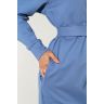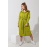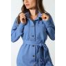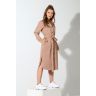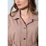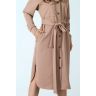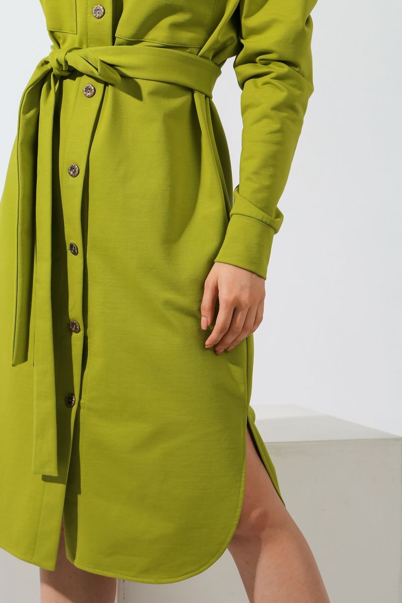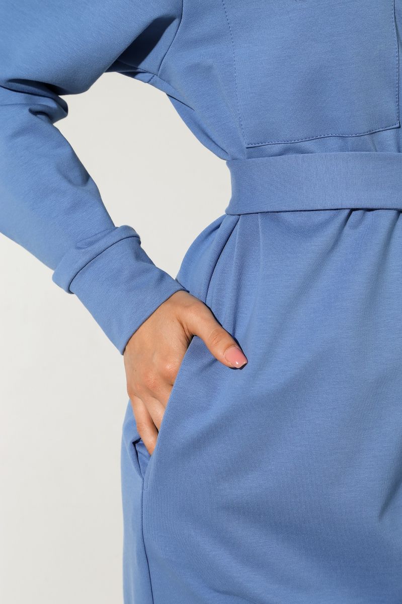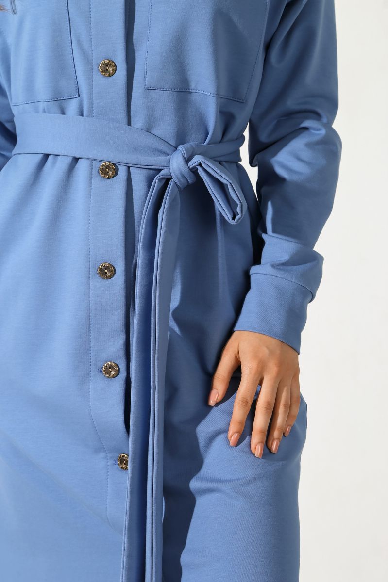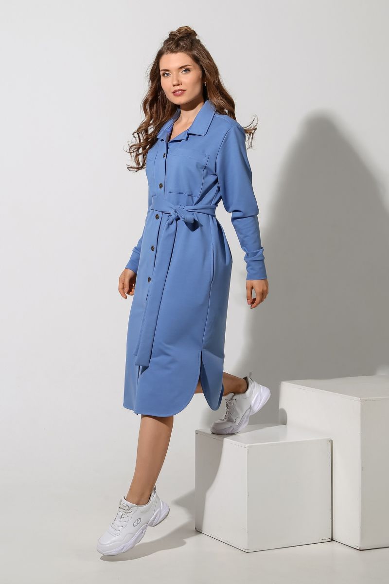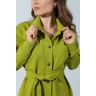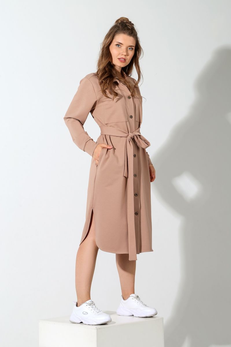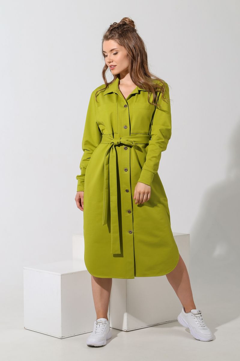 Из гладкокрашеного трикотажного полотна «футер-двунитка», удлиненное, прямого силуэта, с длинными втачными рукавами, стояче-отложным воротником, карманами в боковых швах, центральной бортовой застежкой на обметанные петли и пуговицы, фигурной линией низа и съемным завязывающимся поясом. Полочка – с двумя накладными нагрудными карманами прямоугольной формы. Спинка – с притачной кокеткой и бантовой складкой в соединительном шве. Рукава – с притачными манжетами.