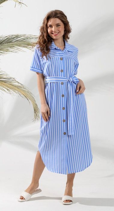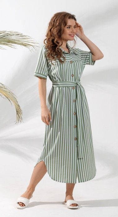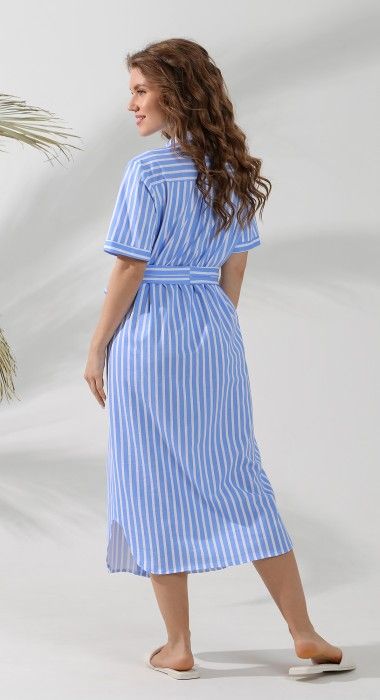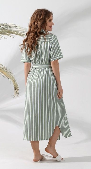 Платье молодежное из трикотажного полотна «кулирка» с набивным рисунком в полоску, удлиненное, прямого силуэта, с короткими втачными рукавами, стояче-отложным воротником, фигурной линией низа и центральной бортовой застежкой на обметанные петли и пуговицы, со съемным поясом, завязывающимся на талии. Полочки – с горизонтально расположенными кокетками. Спинка – с горизонтальной кокеткой, в шве соединения которой с основной деталью обработана бантовая складка. Нижние срезы рукавов обработаны притачными манжетами. Основные детали полочек, спинка и рукава выкроены с вертикальным направлением полоски, кокетки и манжеты рукавов – с горизонтальным направлением.