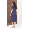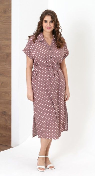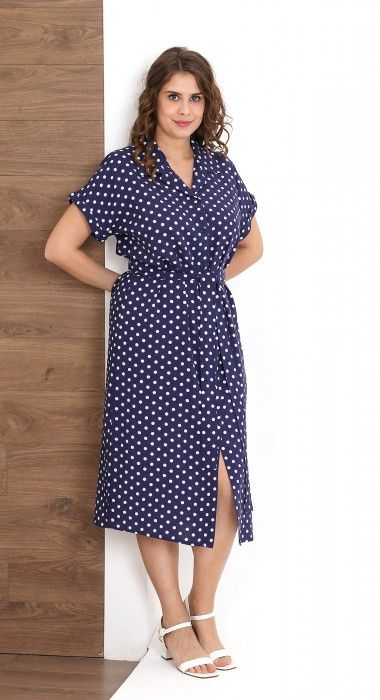 Платье женское из платьевой штапельной ткани с рисунком в горох свободного покроя, прямого силуэта, с короткими цельнокроеными рукавами, стояче-отложным воротником, центральной бортовой застежкой на обметанные петли и пуговицы и разрезами в боковых швах. Рукава – с притачными манжетами-отворотами.