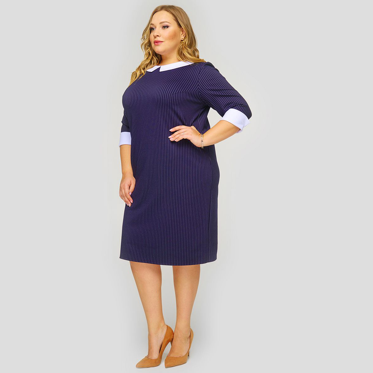 Базовое платье полуприлегающего силуэта из плотного джерси с эластаном. Вырез горловины округлый, рукав 3/4. Воротник и манжеты-отвороты белого цвета.
