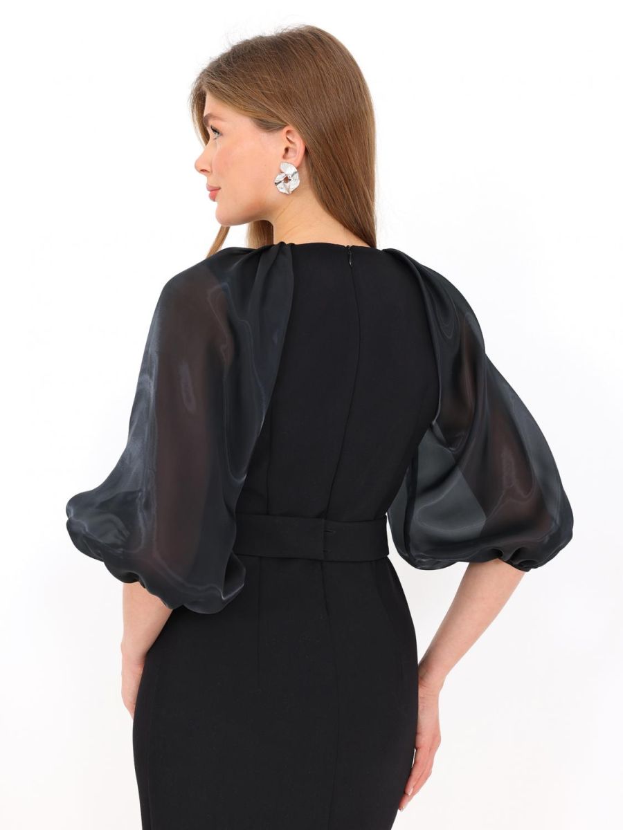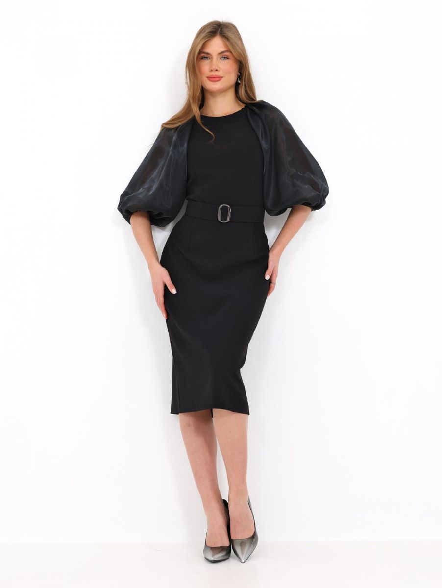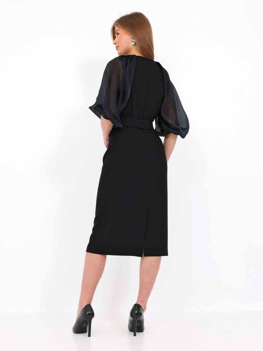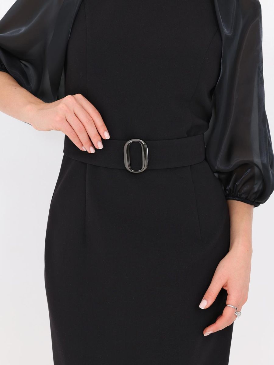 Платье прилегающего силуэта с объемными рукавами. Перед с рельефами и кокетками. Застёгивается сзади на молнию. Широкий пояс в тон усиливает акцент на талии.