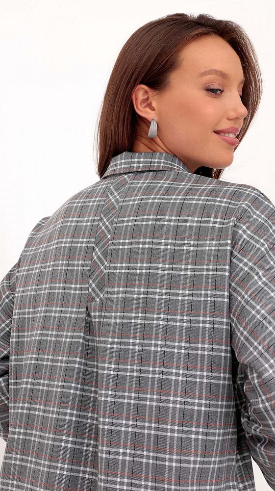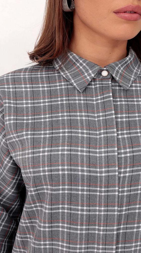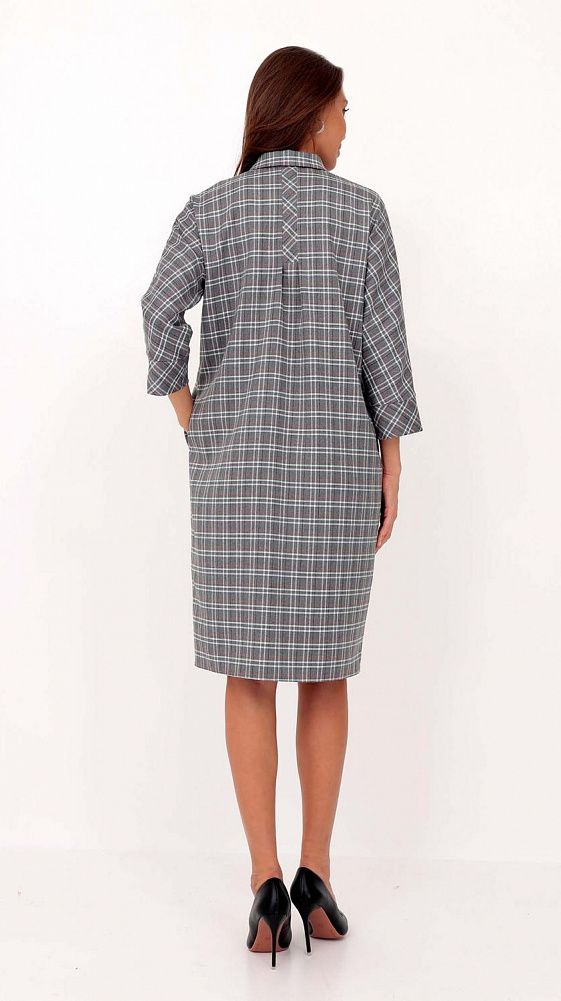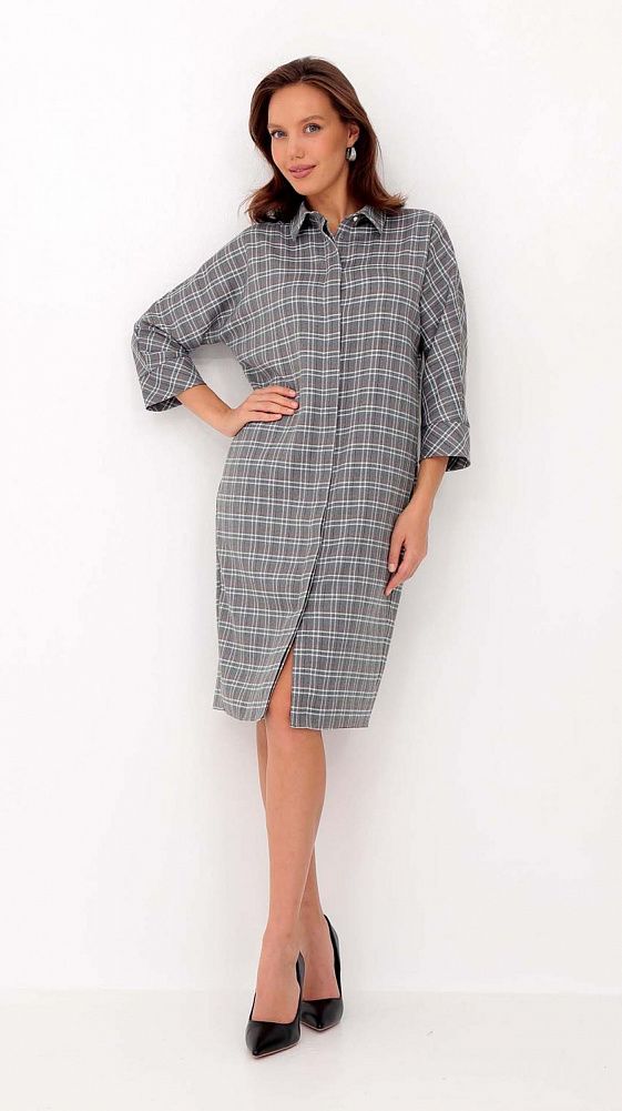 Платье рубашечного кроя, полуприлегающего силуэта. Воротник стойка. Застежка по переду на пуговицы. Функциональные карманы. Рукава 3/4 с отворотом.