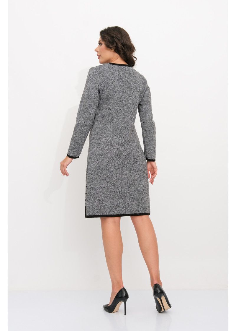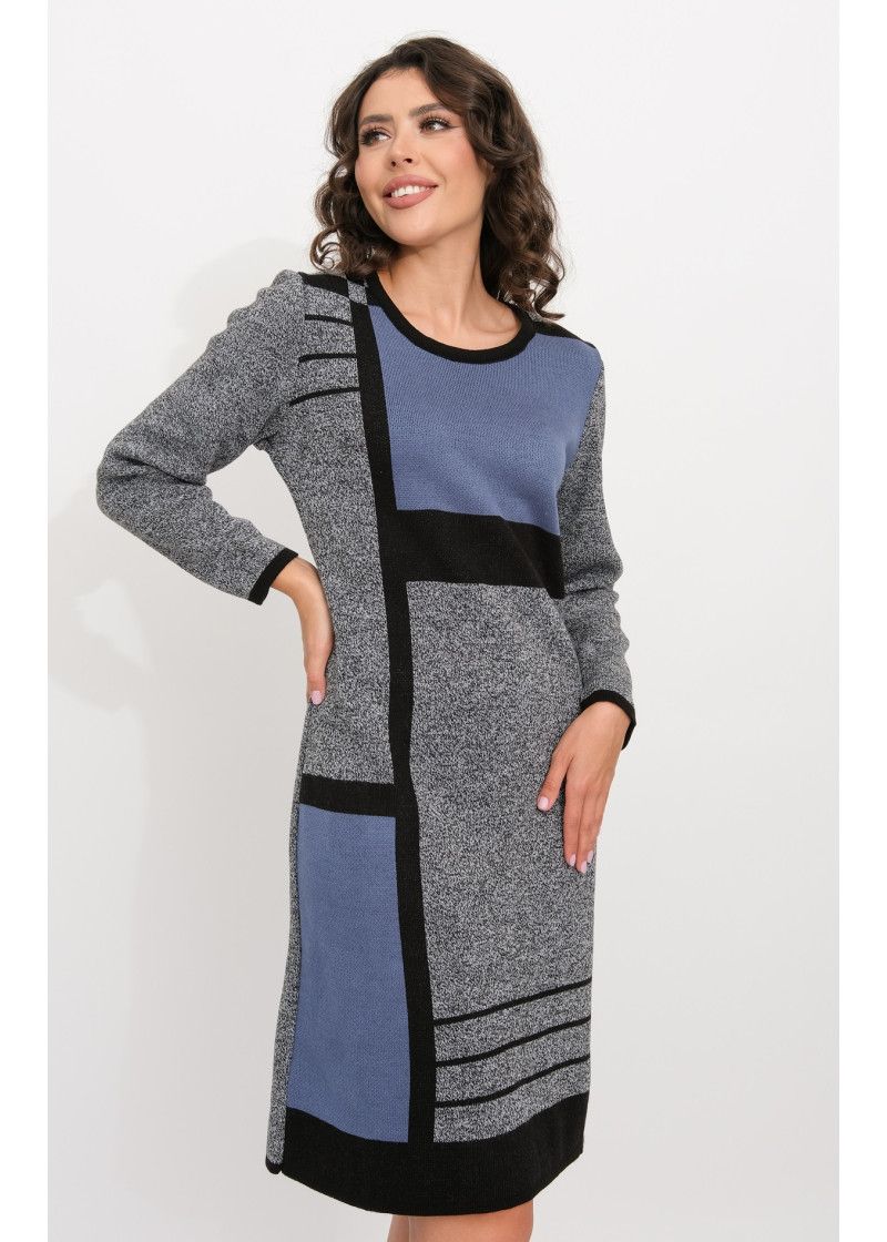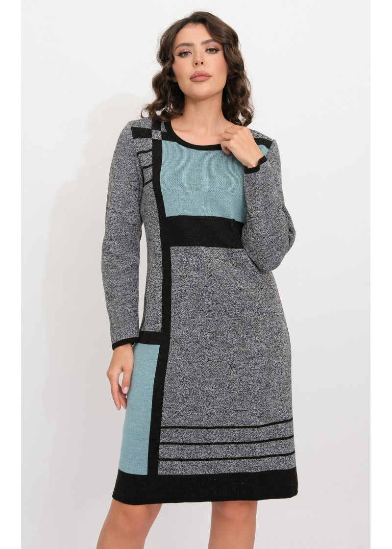 Вязаное платье женское полуприлегающего силуэта длиной до колена. Рукава втачные длинные. Горловина круглая, обработана бейкой. Жаккардовое переплетение из горизонтальных полос контрастного цвета. Платье вязаное из полушерстяной пряжи и подходит для использования в зимний период.