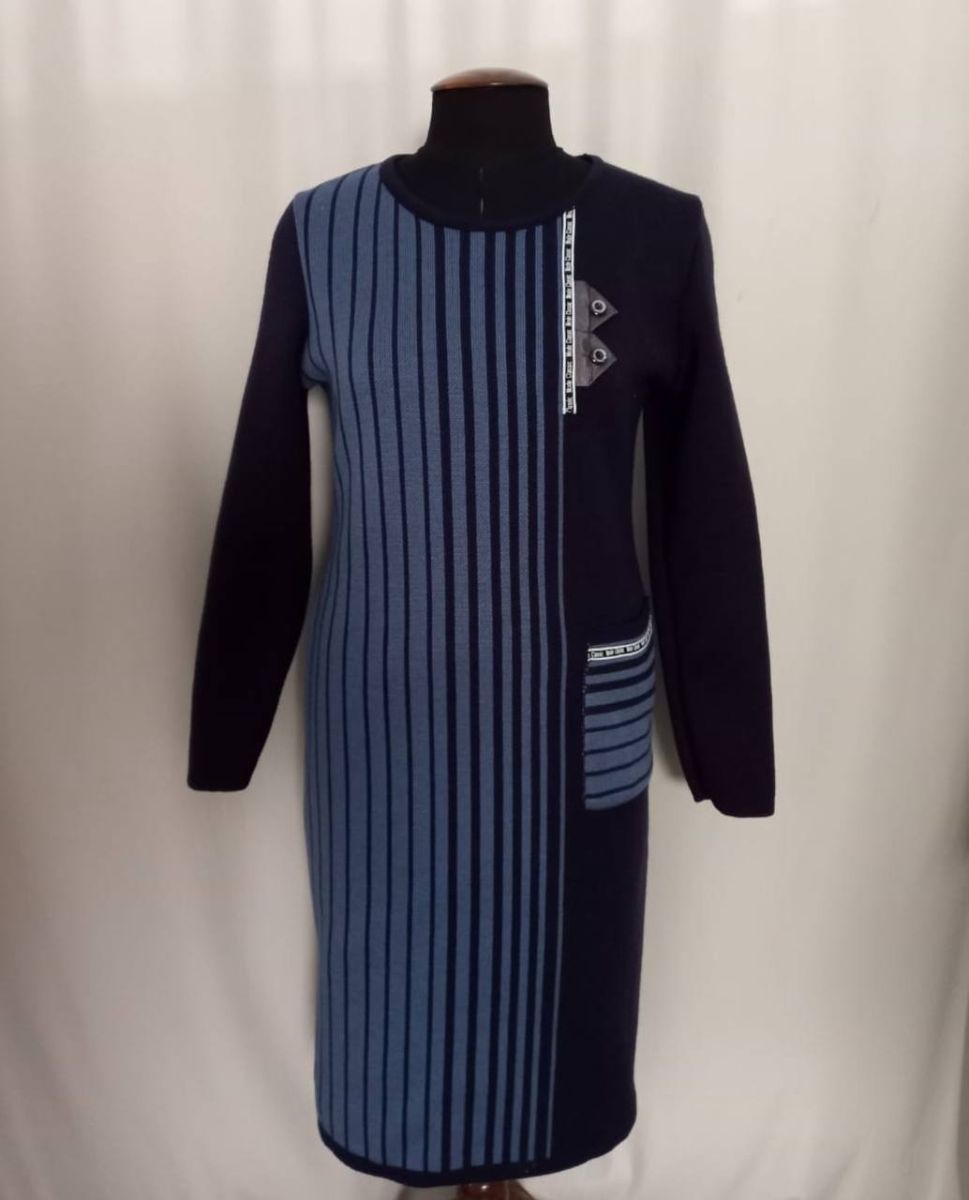 Вязаное платье женское полуприлегающего силуэта длиной до колена. Рукава втачные длинные. Горловина круглая, обработана бейкой. Накладные карманы. Жаккардовое переплетение с вертикальными полосами стройнит фигуру. Платье вязаное из полушерстяной пряжи и подходит для использования в зимний период.