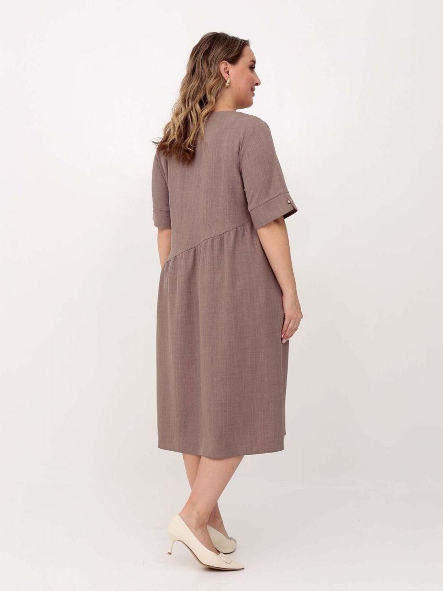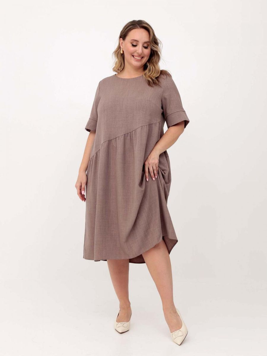 Платье свободное, трапеция. По переду и спинке диагональные подрезы со сборкой по юбке. В боковых швах карманы. Рукава короткие 1/2 понизу широкая манжета, по середине разрез с застежкой на навесную петлю и пуговицу.