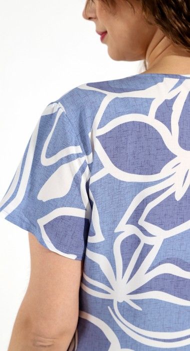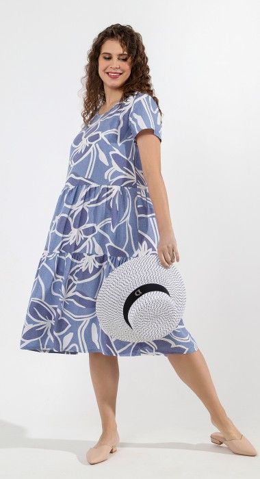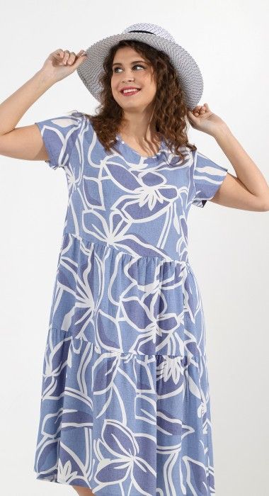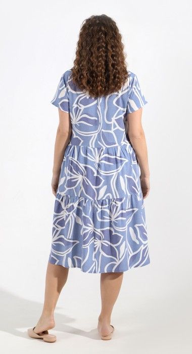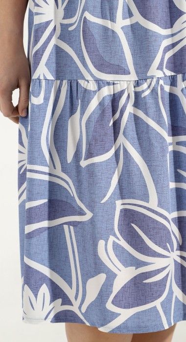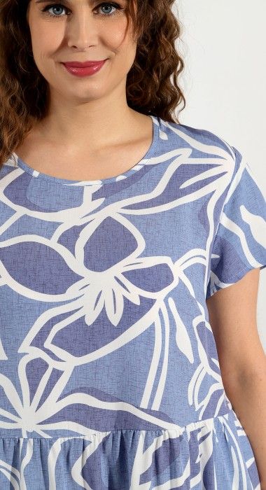 Платье из плательной штапельной ткани с набивным рисунком, свободного покроя, отрезное по линии талии, с короткими втачными рукавами и горловиной овальной формы, обработанной обтачкой. Полочка – с вытачками в области груди. Юбка – из двух ярусов, каждый из которых присборен по шву соединения с верхней деталью.