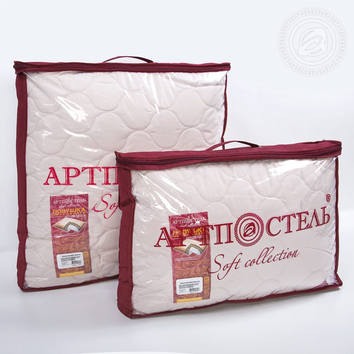 Подушки коллекции «Soft» состоят из чехла (экологически чистого материала - микрофибра), термоскрепленного волокна наполнителя и сверхтонкого полиэфирного силиконизированного микроволокна.