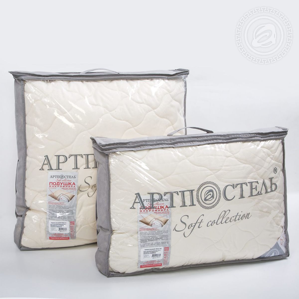 Подушки коллекции «Soft» состоят из чехла (экологически чистого материала - микрофибра), термоскрепленного волокна наполнителя и сверхтонкого полиэфирного силиконизированного микроволокна.