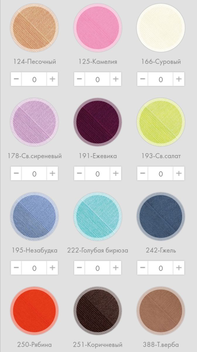 Цветовая палитра пряжи роскошна. Учитывая, что используется она для создания вещей к теплому времени года, наши специалисты постарались воспроизвести все многоцветье природы.