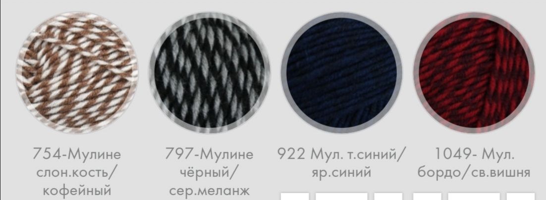 Мул. бордо/св.вишняМул.отбелка/св.бежМул. т.синий/яр.синийМулине слон.кость/кофейный