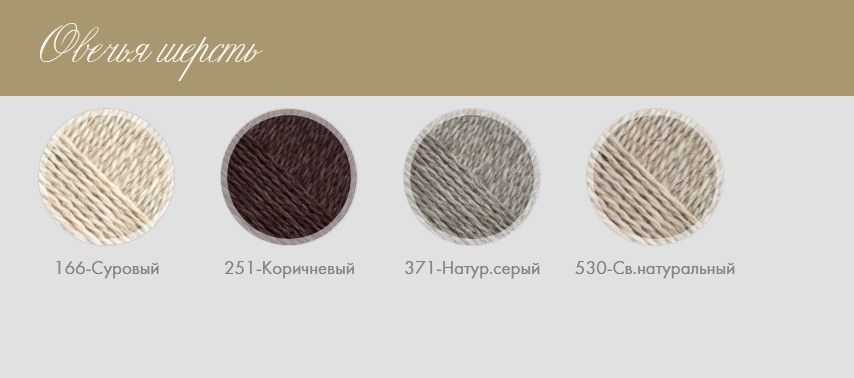Название артикула, без каких-либо дополнительных комментариев, сообщает о нитях все: сырье, полученное от стрижки овец, прошло лишь необходимую перед прядением подготовку и превратилось в роскошную натуральную нить. Цветовая палитра этой пряжи тоже проста: только натуральные расцветки. Однако все, которыми природа окрасила шкурку овец: белый, суровый, серый, коричневый. Для любителей сдержанной пестроты, есть партии со смешанными оттенками.