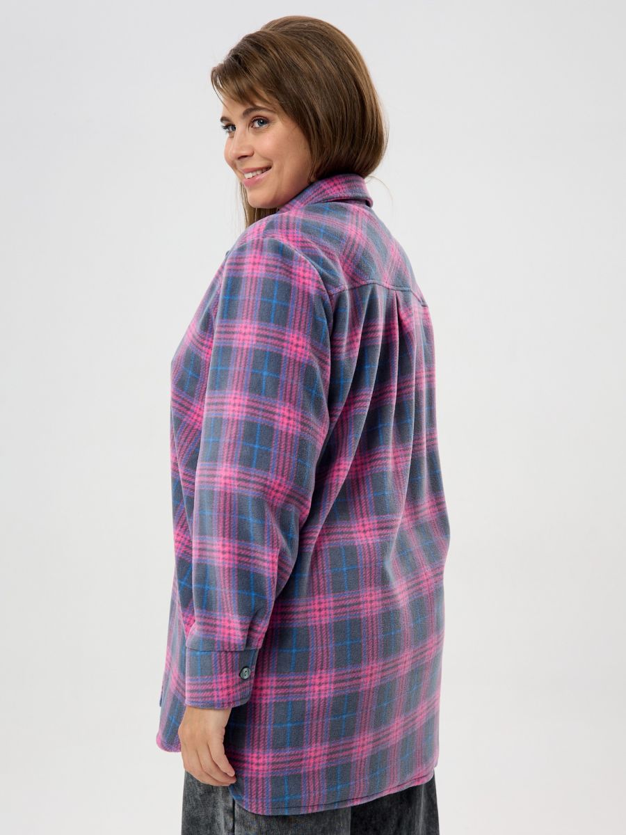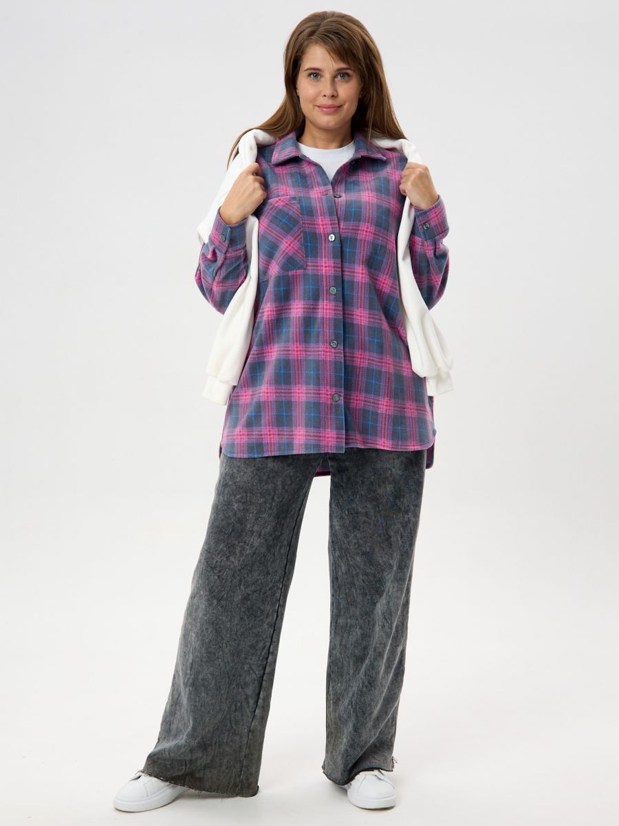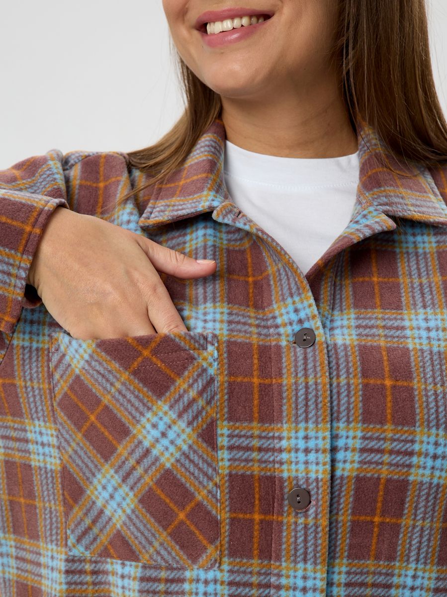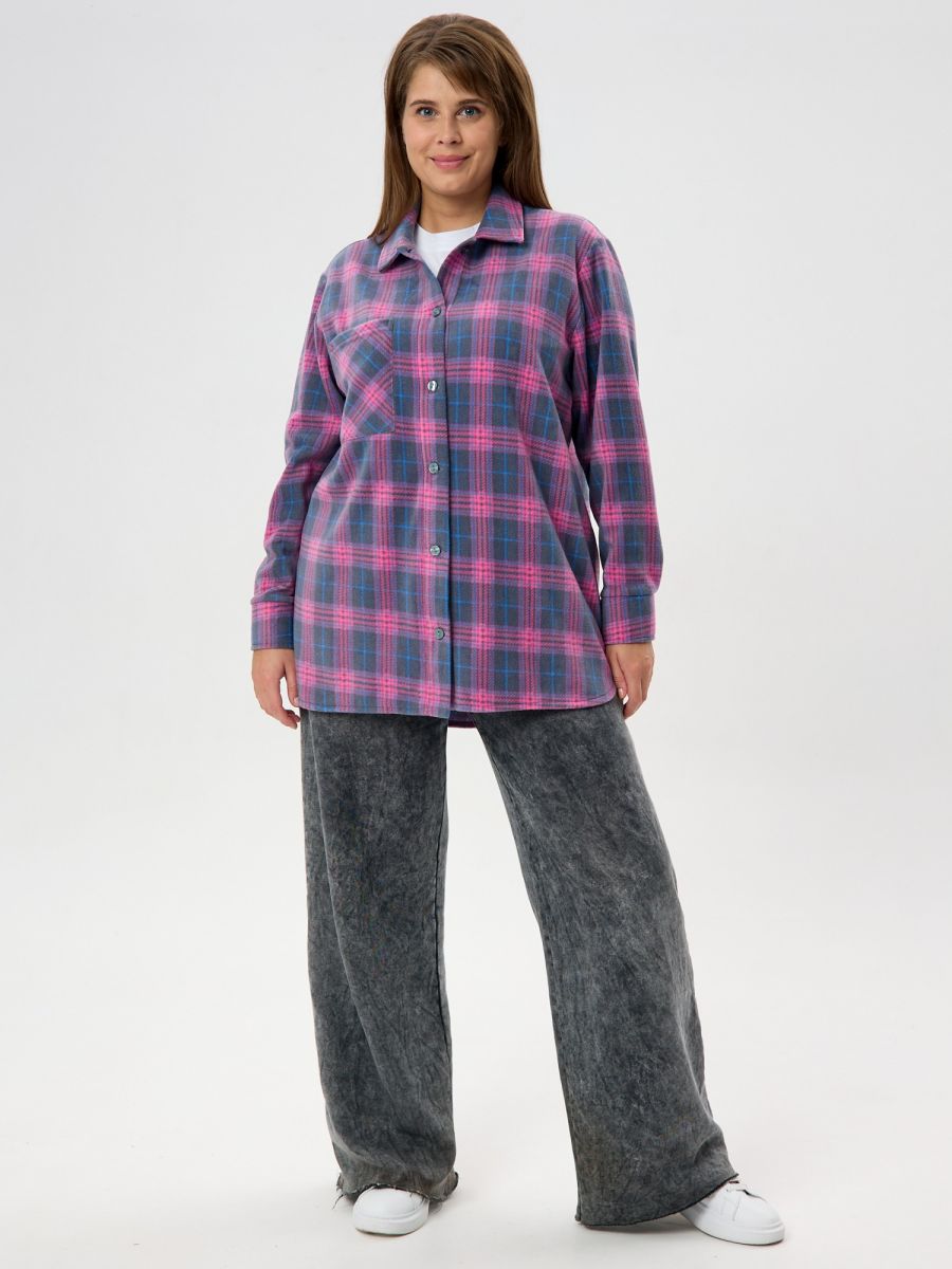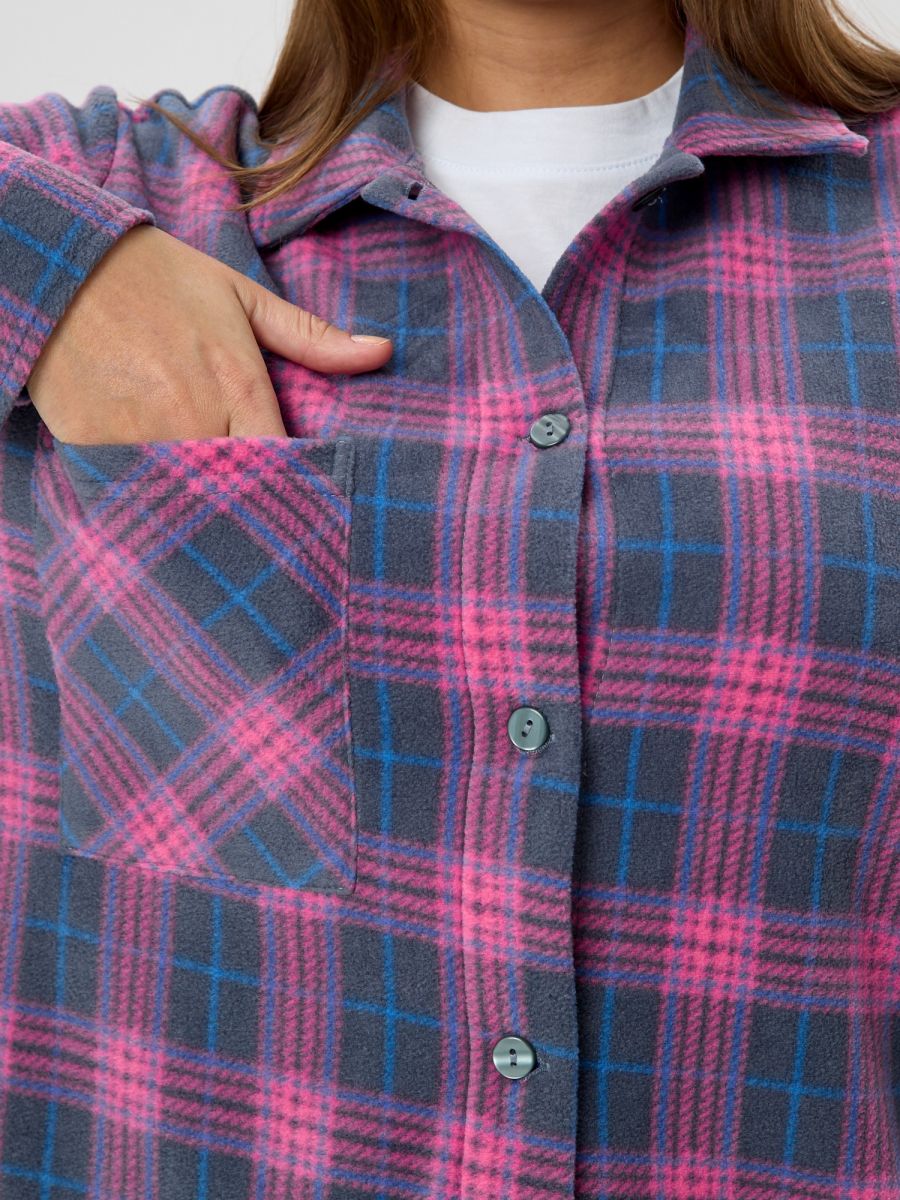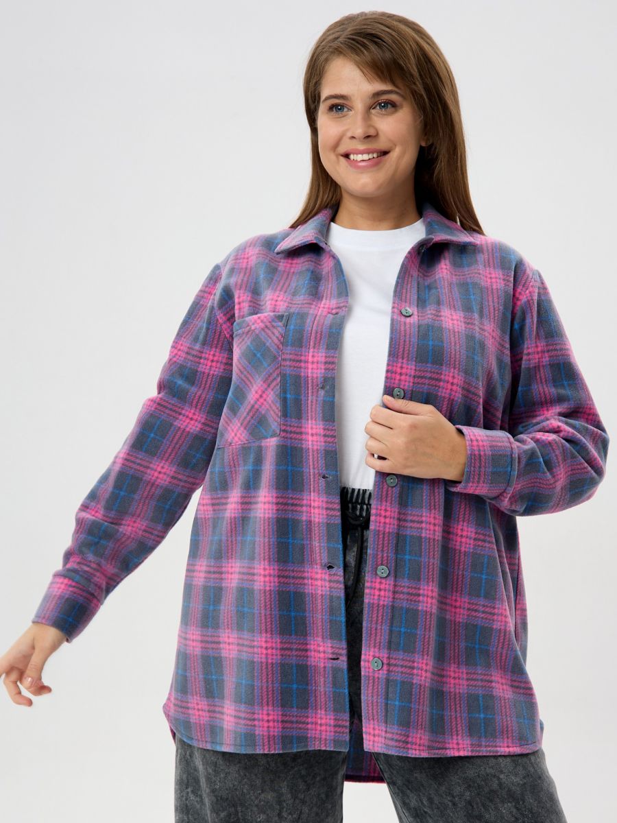 Рубашка (туника) женская из трикотажного полотна «флис» с набивным рисунком «клетка», свободного силуэта, с длинными втачными рукавами напритачных манжетах, стояче-отложным воротником, нагрудным карманом,фигурным низом и центральной бортовой застежкой на петли и пуговицы. Спинка – с отрезной кокеткой и бантовой складкой в центре соединительного шва.