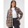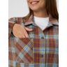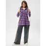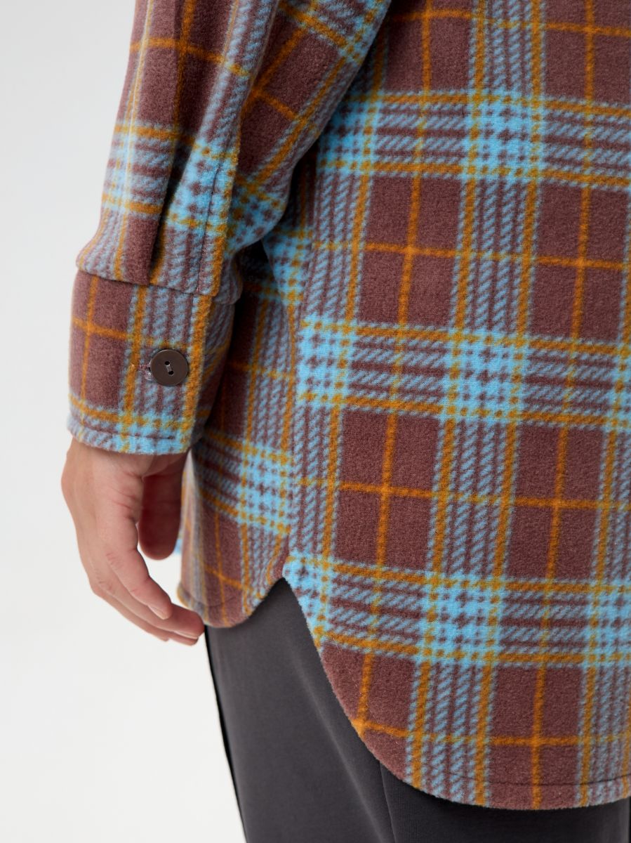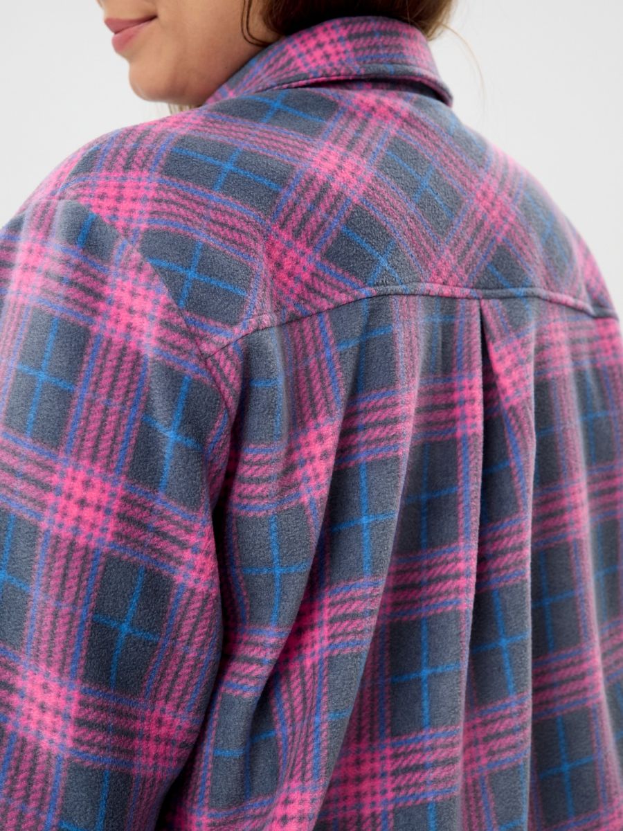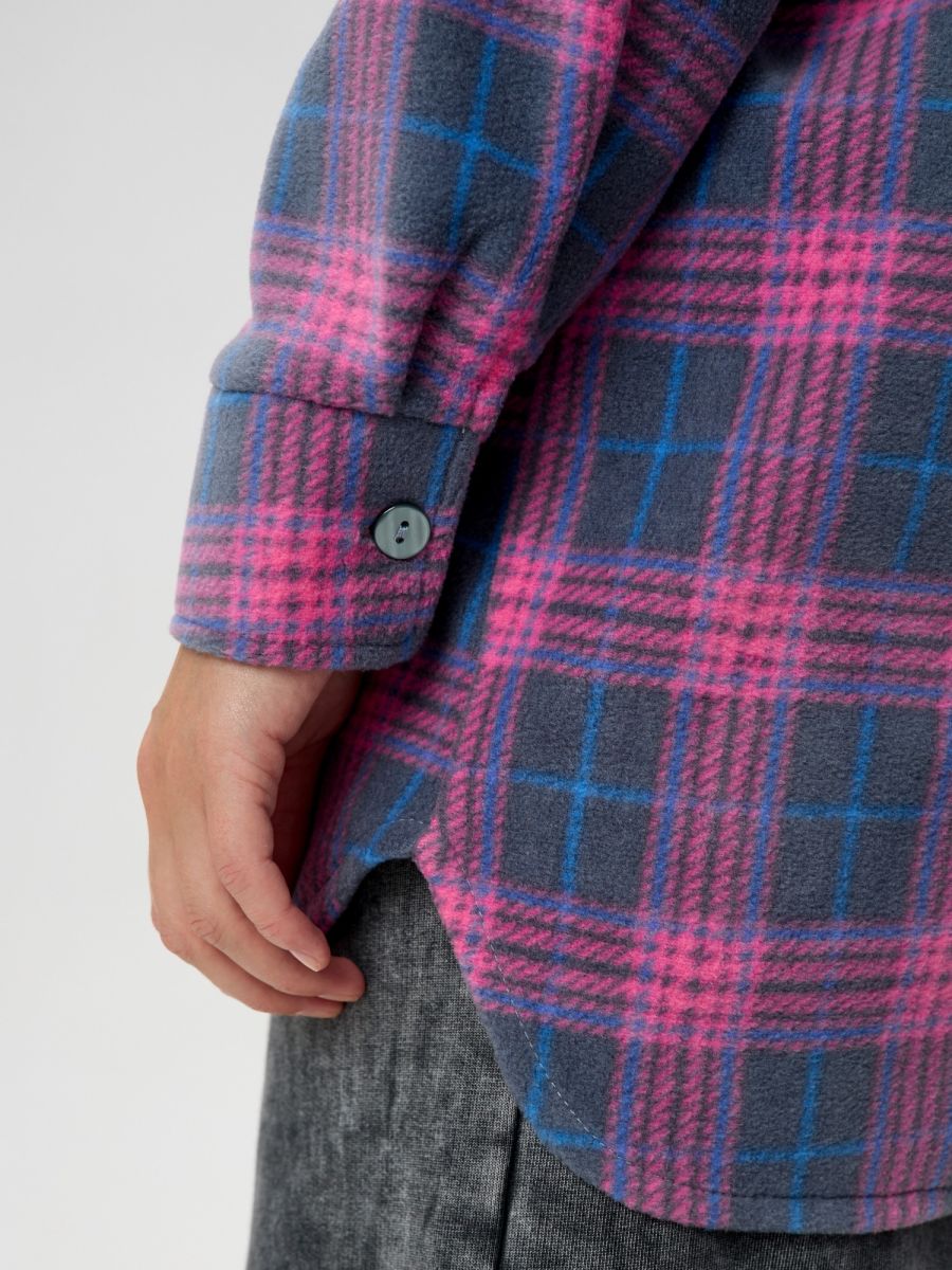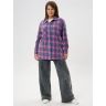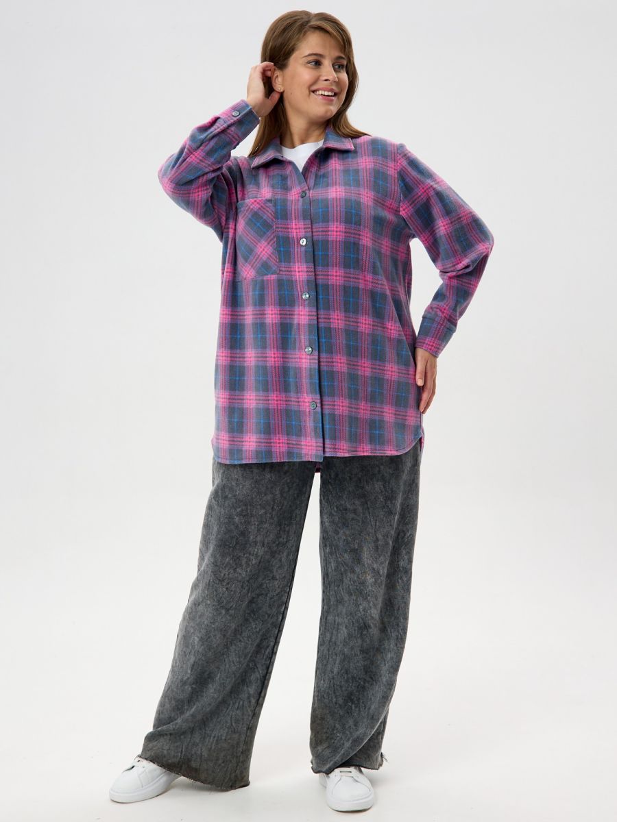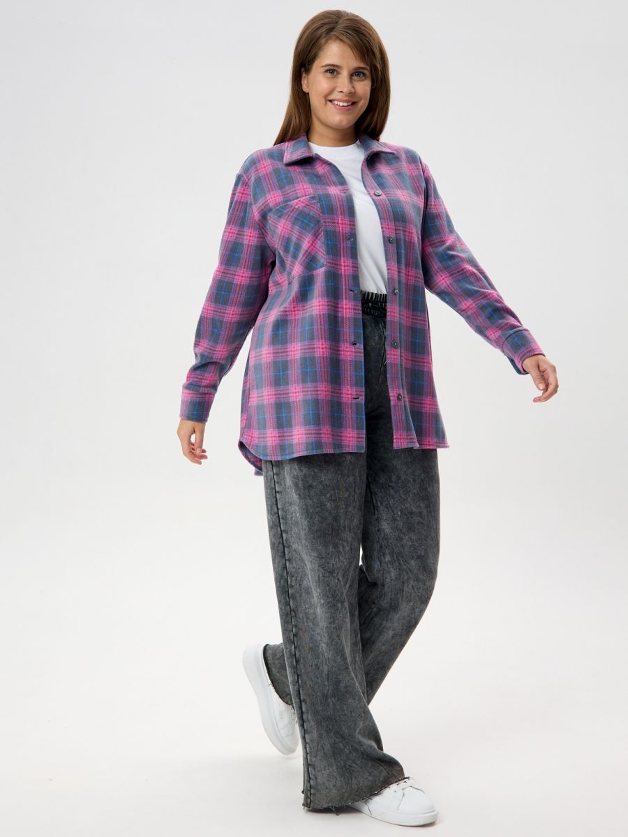 Рубашка (туника) женская из трикотажного полотна «флис» с набивным рисунком «клетка», свободного силуэта, с длинными втачными рукавами напритачных манжетах, стояче-отложным воротником, нагрудным карманом,фигурным низом и центральной бортовой застежкой на петли и пуговицы. Спинка – с отрезной кокеткой и бантовой складкой в центре соединительного шва.