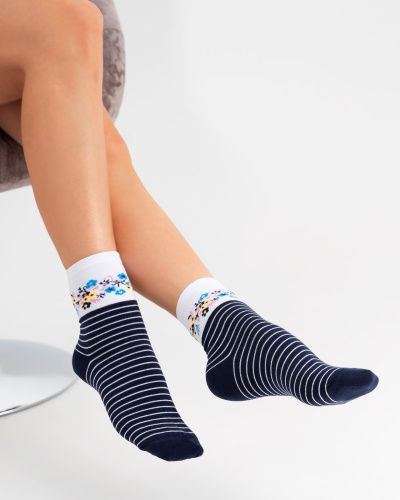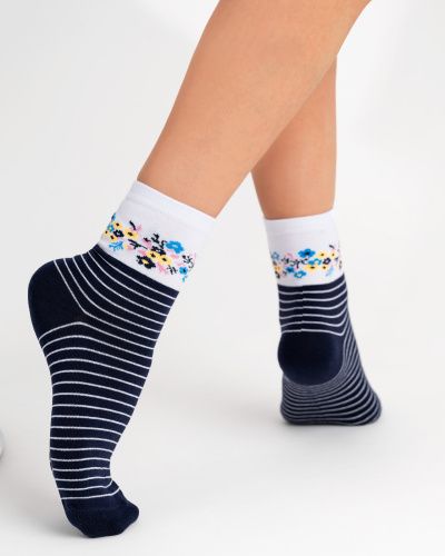 Полосатые женские носки с цветами, изображенными на паголенке изделия. Связаны из натурального гребенного хлопка, который обеспечит максимальный комфорт в течение всего дня. Материалу также свойственны воздухопроницаемость, устойчивость к истиранию и лёгкость в уходе. Гармоничное сочетание контрастных полос и цветочного рисунка, несомненно, пленит воодушевлённые взгляды.