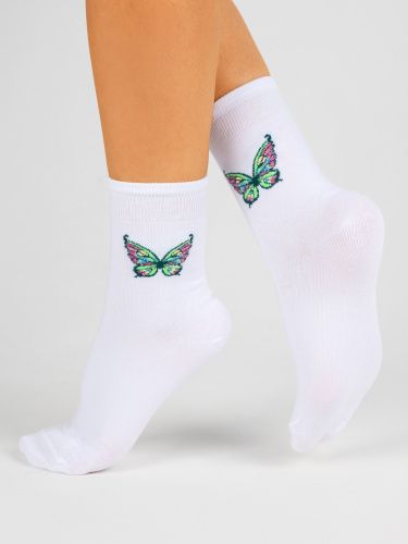 Женские хлопковые носки с люрексом – модный аксессуар в гардеробе. Рисунок бабочки с добавлением люрекса добавит модели оригинальности и блеска. В таких носочках вы точно привлечете к себе внимание. Изделие прекрасно сочетается с разными стилями в одежде и подходит для повседневной носки.