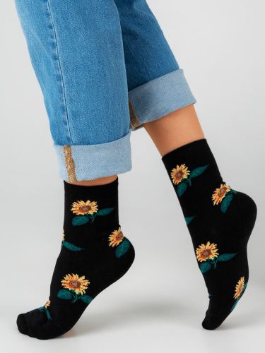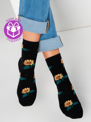 Классическая модель с рисунком цветов подсолнуха. В составе изделия натуральный гребенной хлопок – носки комфортные и тактильно приятные. Модель прекрасно подходит для повседневной носки.