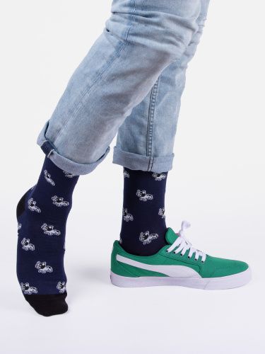 Оригинальная модель демисезонных мужских носков. Изображение французского бульдога на глубоком синем фоне привлекает внимание. Носки тонкие и дышащие из-за преобладания в составе хлопка, синтетические нити обеспечивают прочность, эластичность и устойчивость к растяжению. За счёт упругой резинки носки надёжно сидят на ногах.