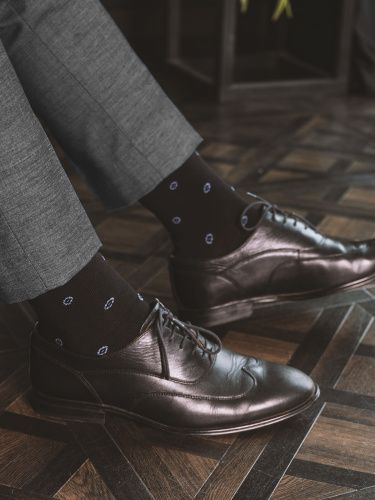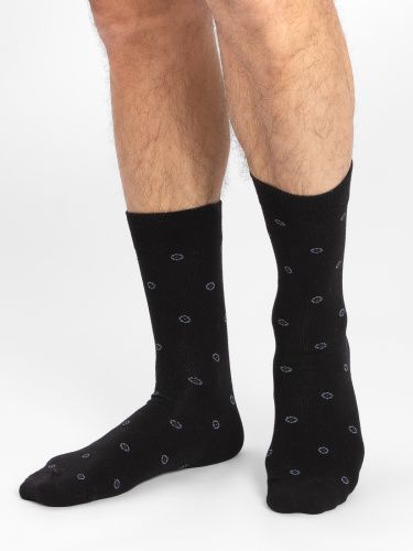 Демисезонные мужские носки из хлопка. За счёт синтетических нитей носки устойчивы к растяжению, упруги и эластичны. Широкая резинка мягко держит носок на ноге. У модели спокойный дизайн - мелкий рисунок горошком добавляет изюминки строгому чёрному цвету. Оригинальные носки для повседневного гардероба.