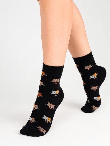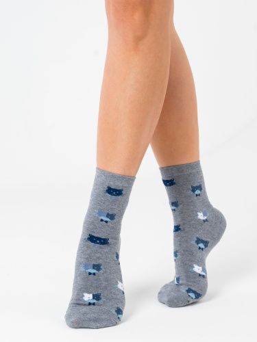 Женские носки с рисунком кошек. За счет мягкой натуральной основы из гребенного хлопка в носках будет удобно и уютно на протяжении дня. Для эластичности и повышенной устойчивости к истиранию в состав добавлены синтетические нити. Носки с привлекательным рисунком кошачьих мордочек сделают образ более стильным и подчеркнут вашу индивидуальность.