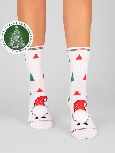 Женские новогодние носки. Креативная модель, связанная из натурального гребенного хлопка, находка для повседневной носки, очень мягкая и комфортная. Милейшие гномики и рисунки ёлочек на паголенке поднимут настроение вам и вашим близким и подарят ощущение сказки. Носки связаны в минималистичном стиле, они станут прекрасным дополнением к зимнему гардеробу.