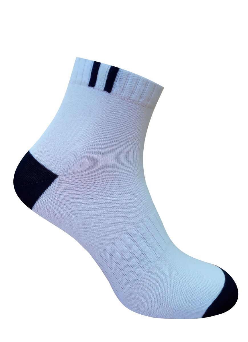 укороченные мужские спортивные носки с контрастными пятками, широкой резинкой на середине следа изделия (для лучшей фиксации носка) и небольшим контрастным рисунком в виде вертикальных полос на борте