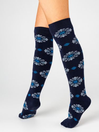 Женские гольфы с рисунком снежинки – стильный аксессуар для зимних праздников. Изделие выполнено из натурального хлопка. Модель теплая и тактильно приятная – в таких гольфах вам будет комфортно как на прогулке, так и дома.