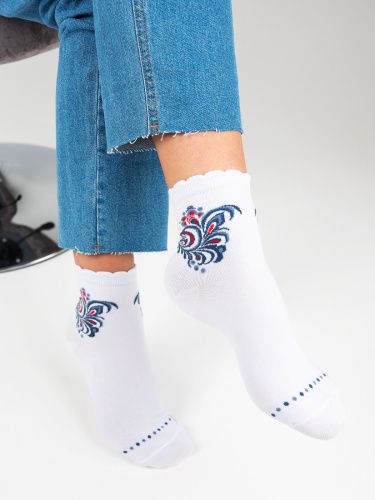 .Женские демисезонные носки из натурального гребенного хлопка. Модель подходит как для повседневной носки, так и для занятий спортом. Носок с ярким рисунком в сочетании с точками вокруг мыска добавят вашему образу индивидуальности и креатива.