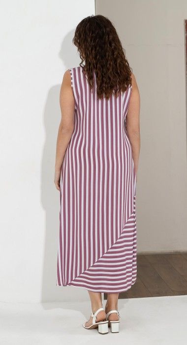 Сарафан женский из штапельной платьевой ткани в полоску, удлиненный, свободного покроя, слегка расширенный книзу, с горловиной овальной формы и разрезом в нижней части левого бокового шва. Полочка – из четырех частей, выкроенных с различным направлением полоски. Спинка – из двух частей, выкроенных с различным направлением полоски. Горловина и проймы окантованы основной тканью.